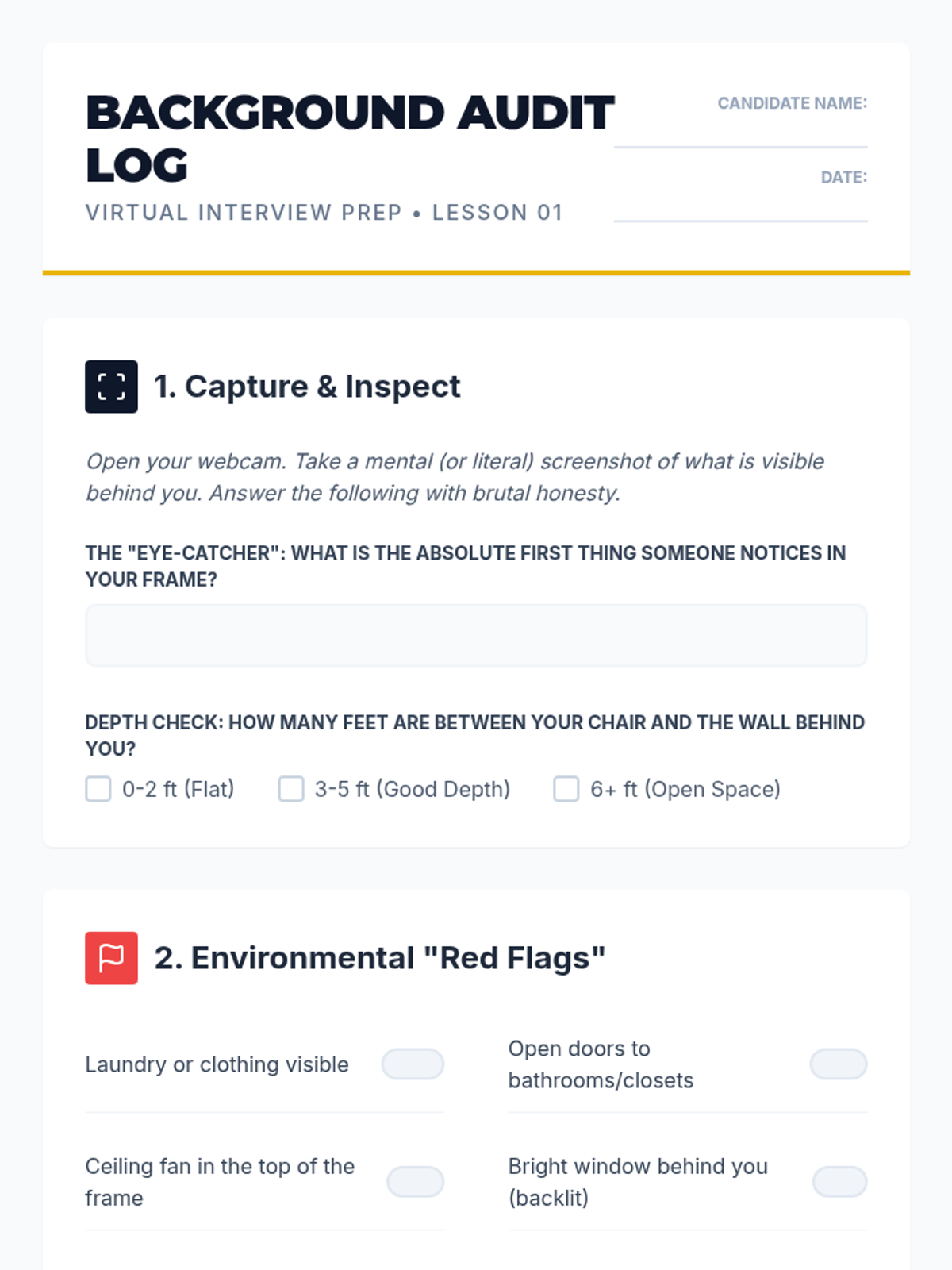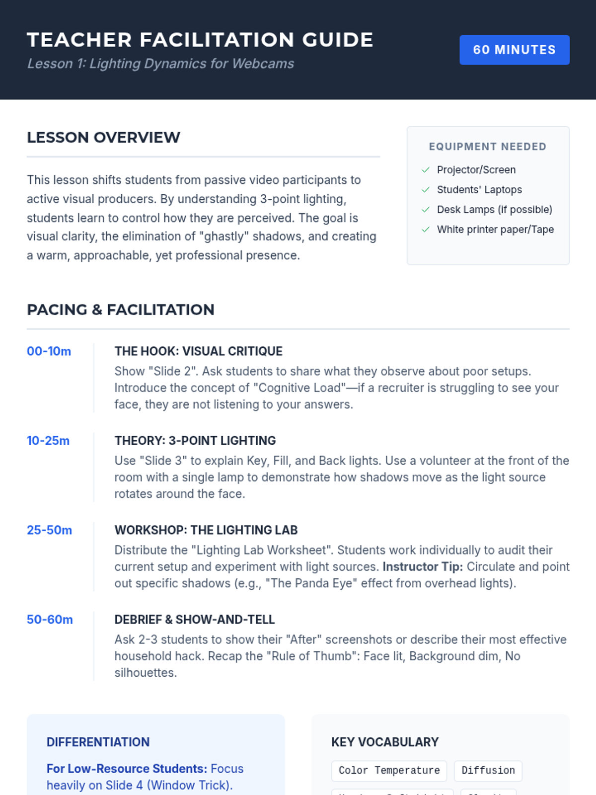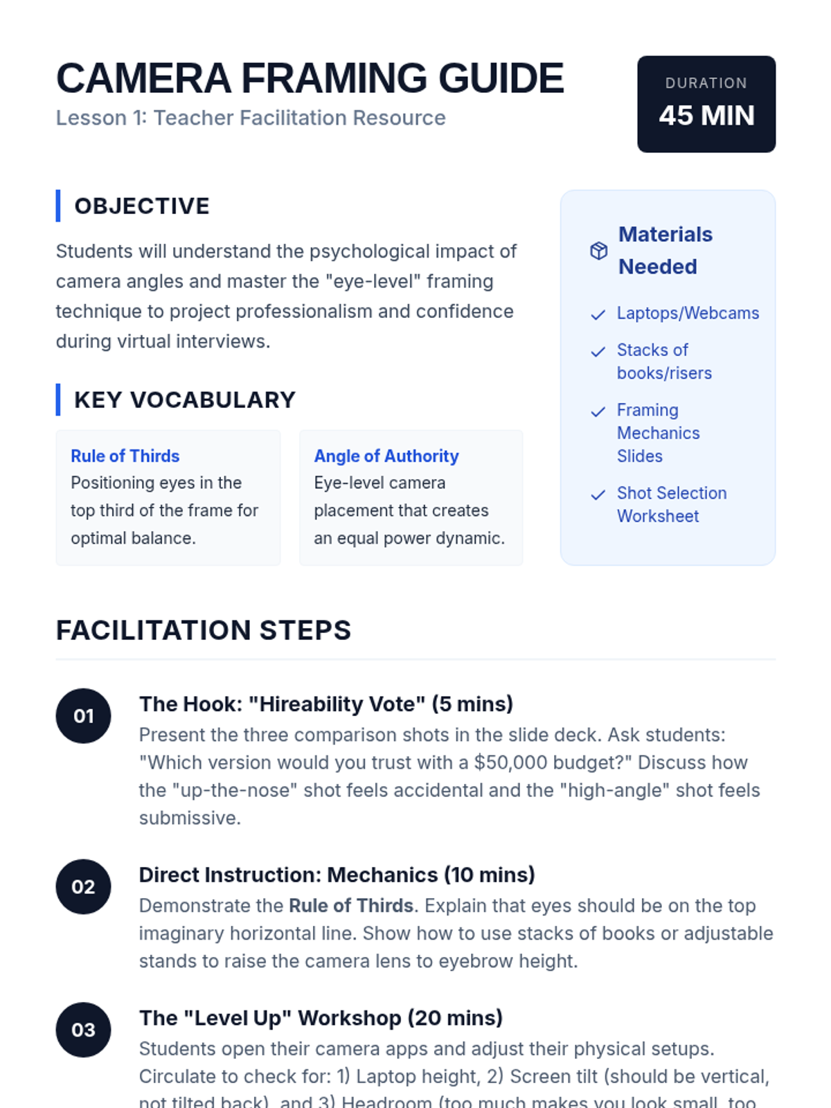 A comprehensive 5-lesson series designed to help 12th-grade students master the technical aspects of virtual interviews. Students will transform their personal spaces into professional digital studios by mastering camera framing, lighting, acoustics, and background curation, culminating in a high-stakes tech-check protocol.