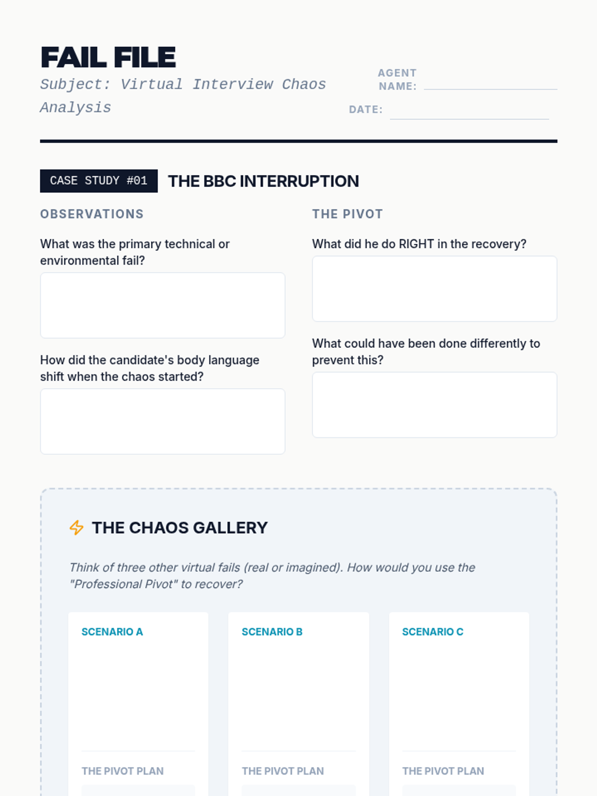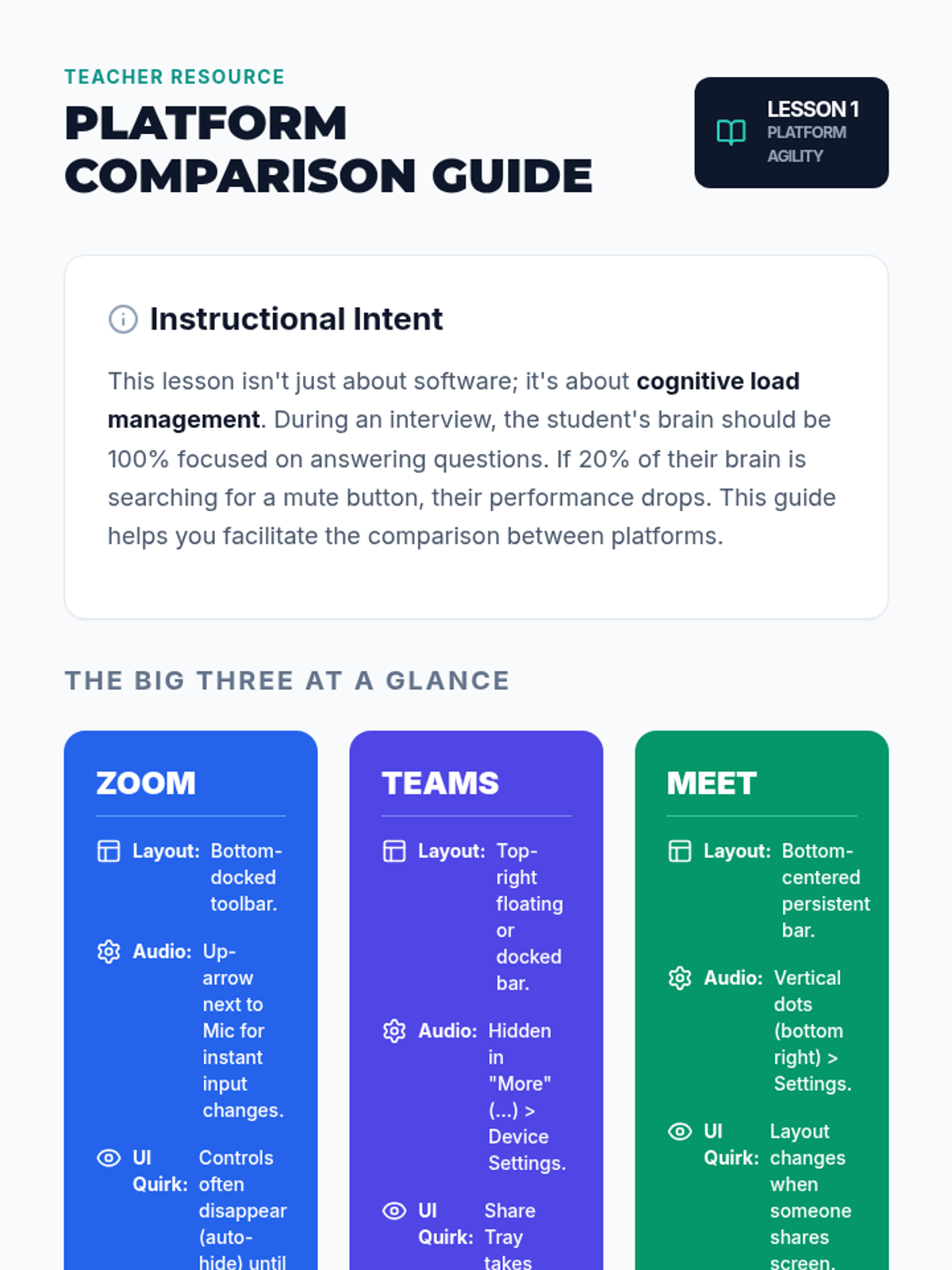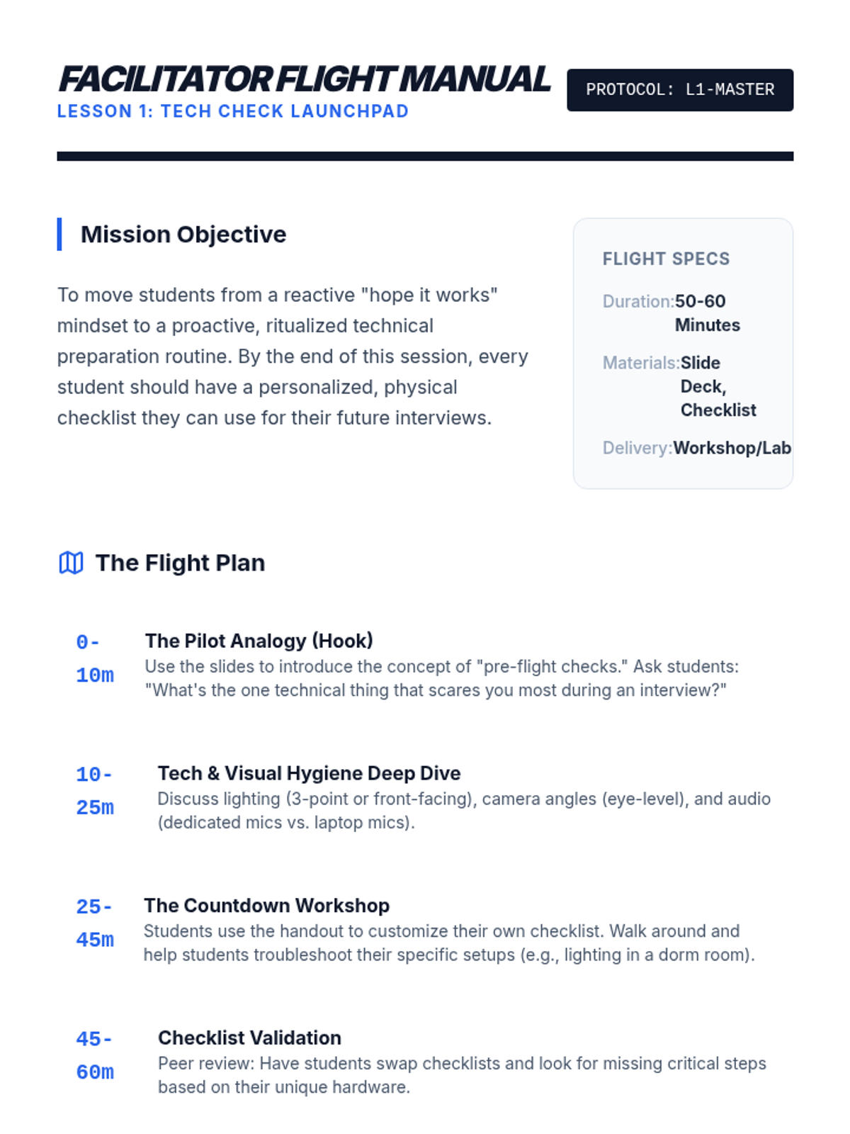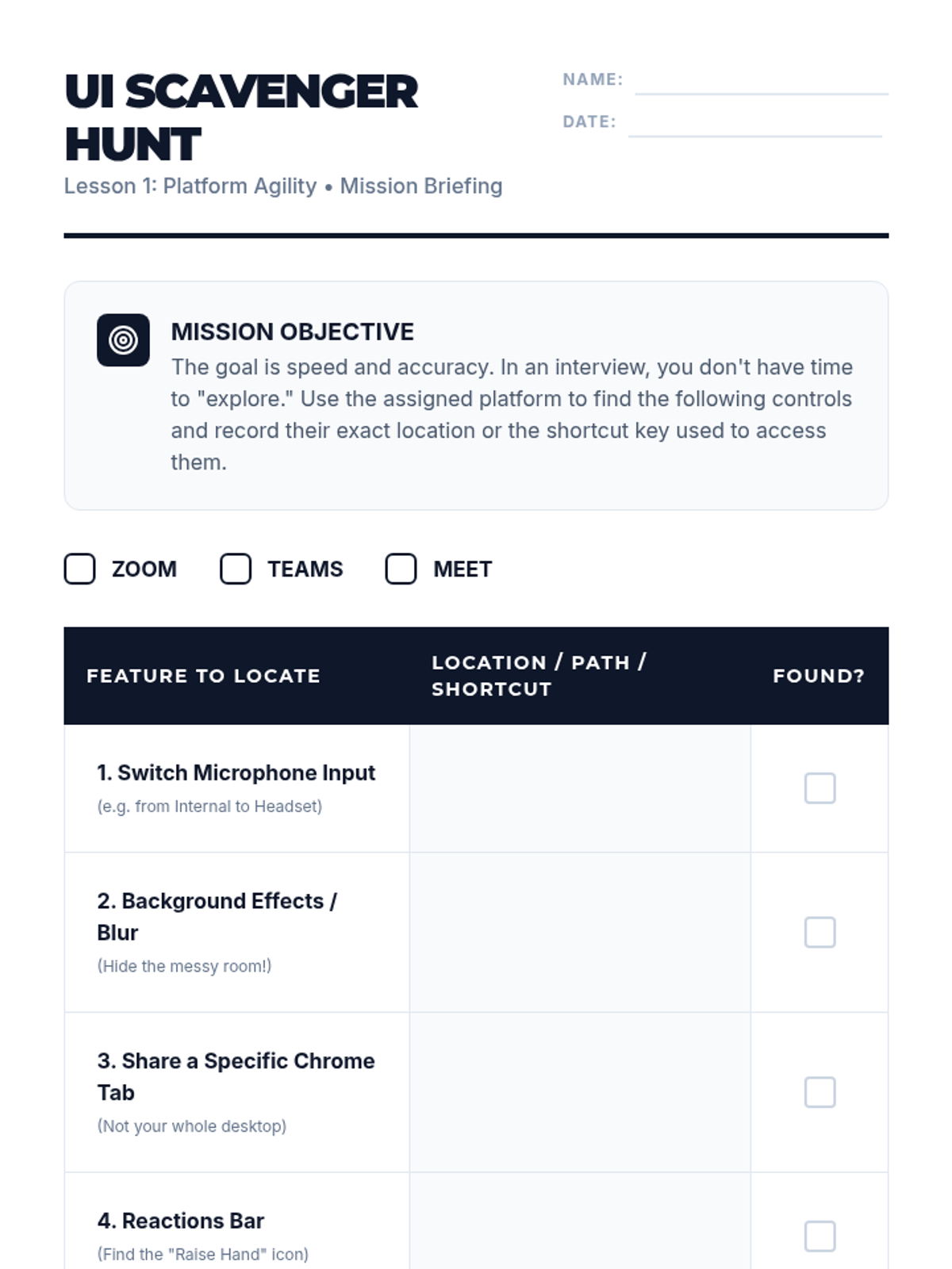 A comprehensive sequence for undergraduate students focused on mastering virtual interview platforms (Zoom, Teams, WebEx) and developing the resilience needed to handle technical failures with professional grace. Students move from platform fluency to real-time crisis management simulations.