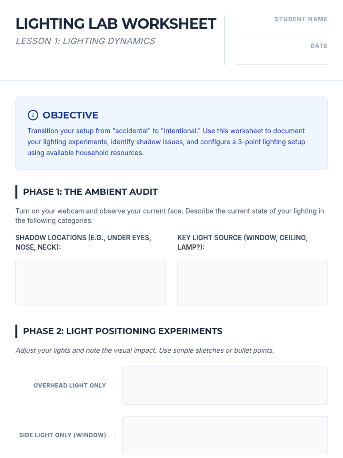 A comprehensive workshop-style sequence for 11th-grade students to master the technical aspects of virtual interviews. Students transform their personal spaces into professional broadcast environments by focusing on background auditing, lighting physics, audio engineering, and camera framing.