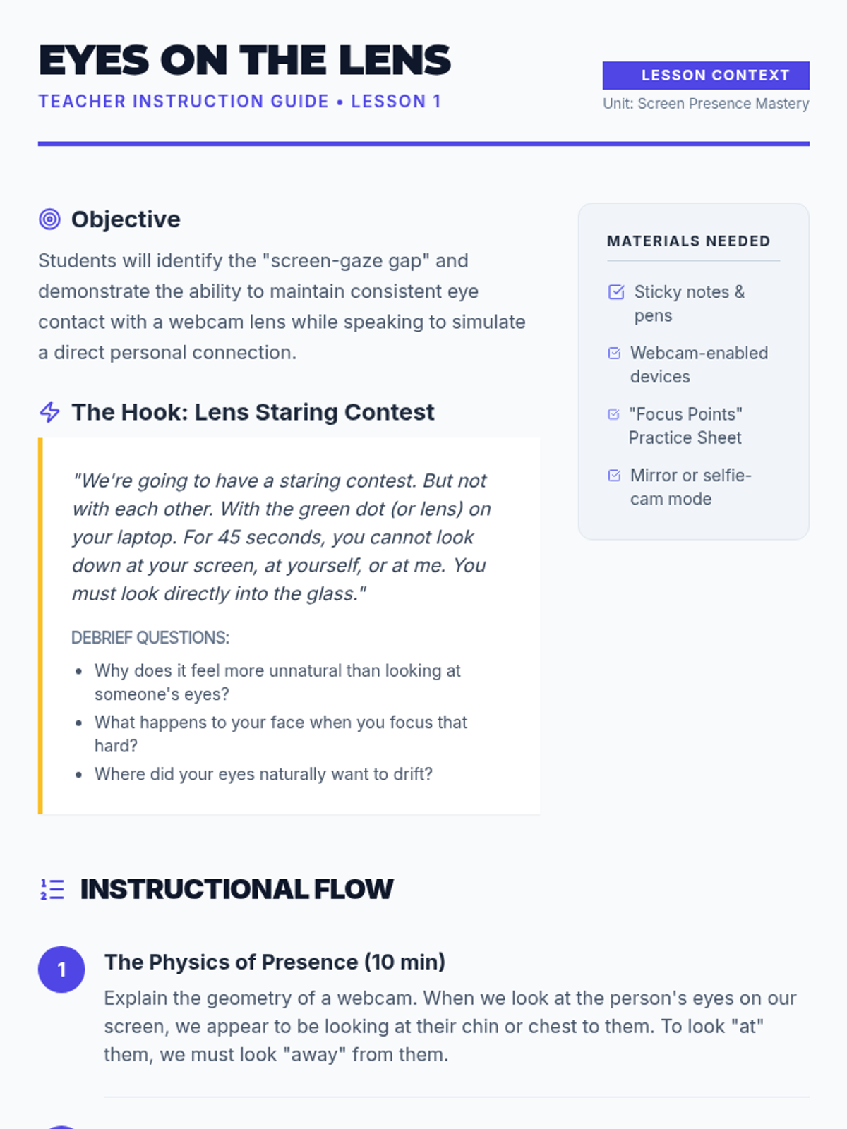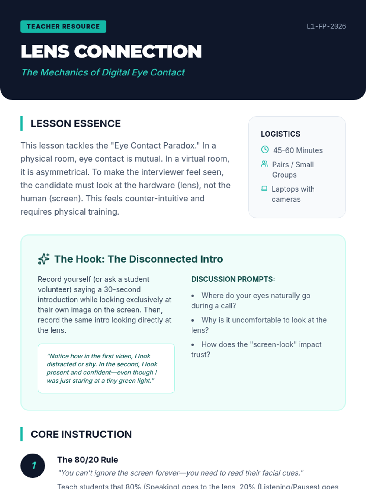 This sequence helps undergraduate students bridge the gap between in-person and digital communication. It focuses on adapting non-verbal cues—eye contact, active listening, posture, and gestures—specifically for the 2D constraints of a video call to build trust and professional warmth.