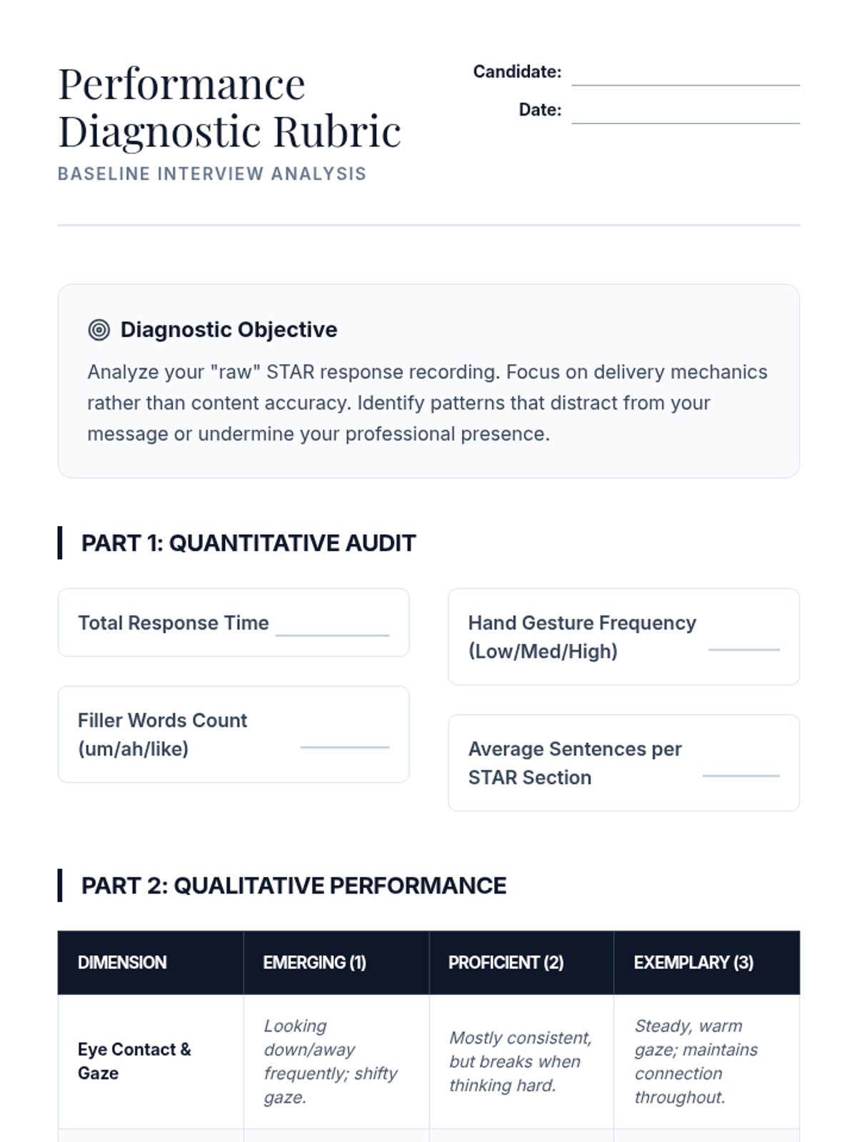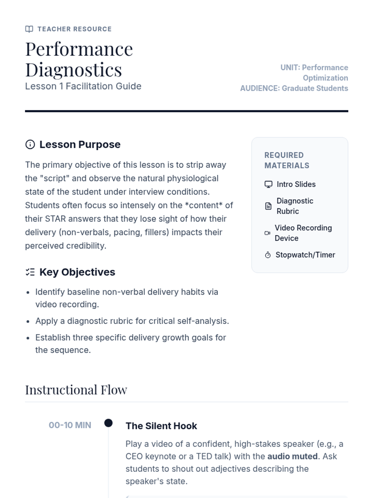 A graduate-level sequence focused on the delivery, pacing, and psychological performance aspects of the STAR method. This unit transitions from content mastery to high-stakes simulation, video analysis, and stress management.
