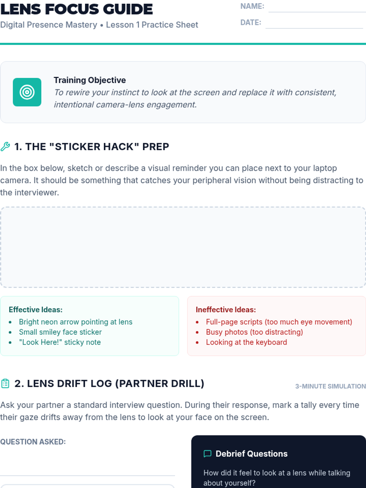 A comprehensive 12th-grade sequence focusing on the non-verbal nuances of virtual interviews, from digital eye contact to frame-aware gesturing and silent active listening.