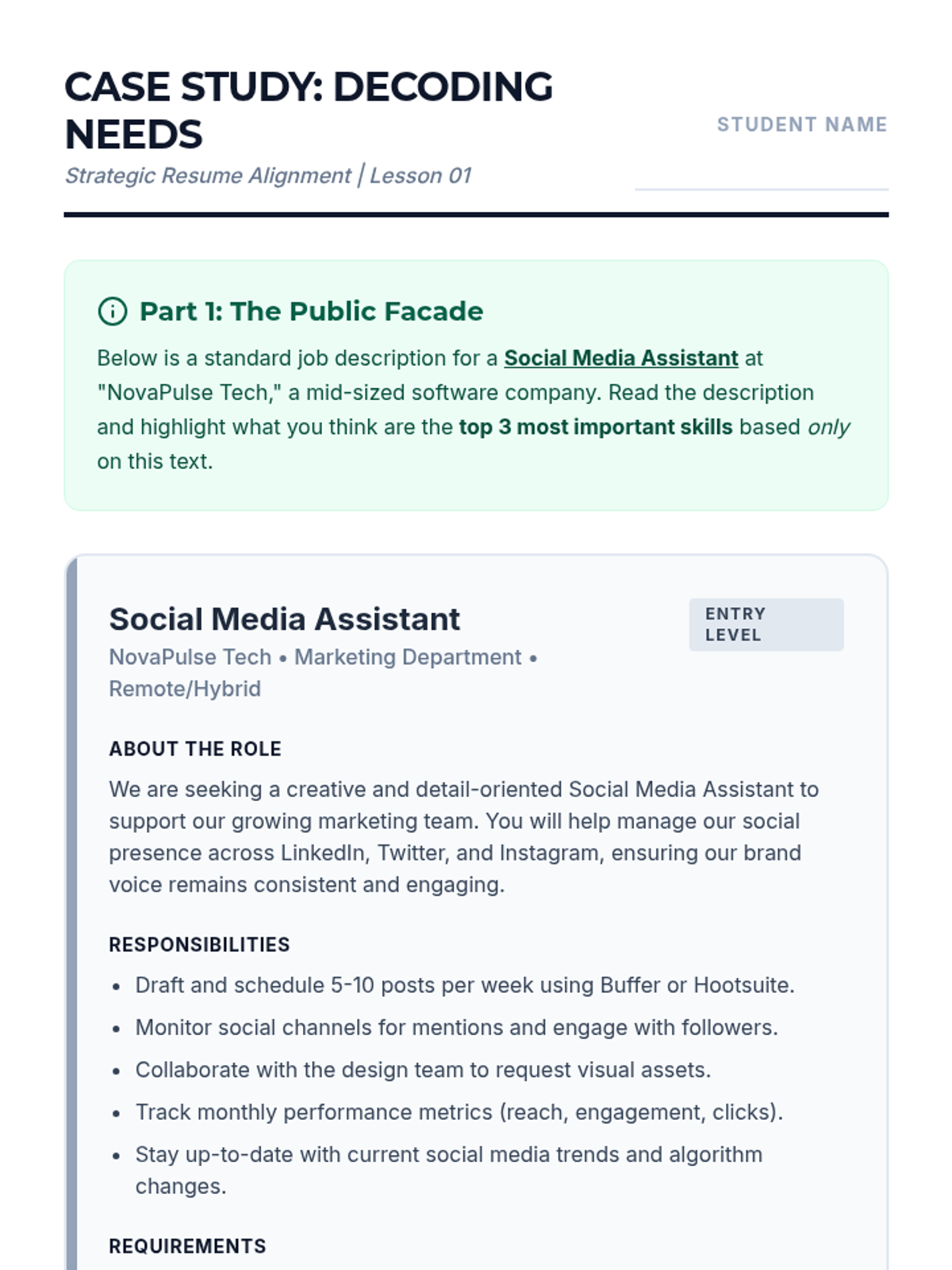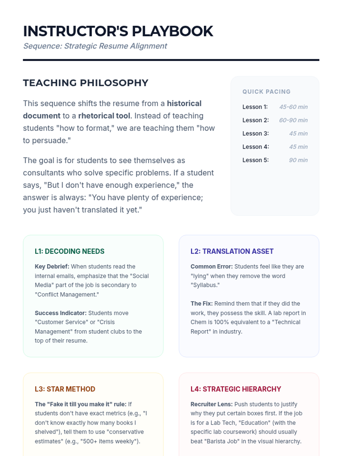 This sequence teaches undergraduate students how to strategically tailor their resumes to specific job descriptions by analyzing employer pain points, translating academic experiences into professional assets, and using the STAR method to quantify impact. Students will move beyond technical compliance to master the rhetorical art of presenting themselves as the ideal solution to an employer's unique problems.