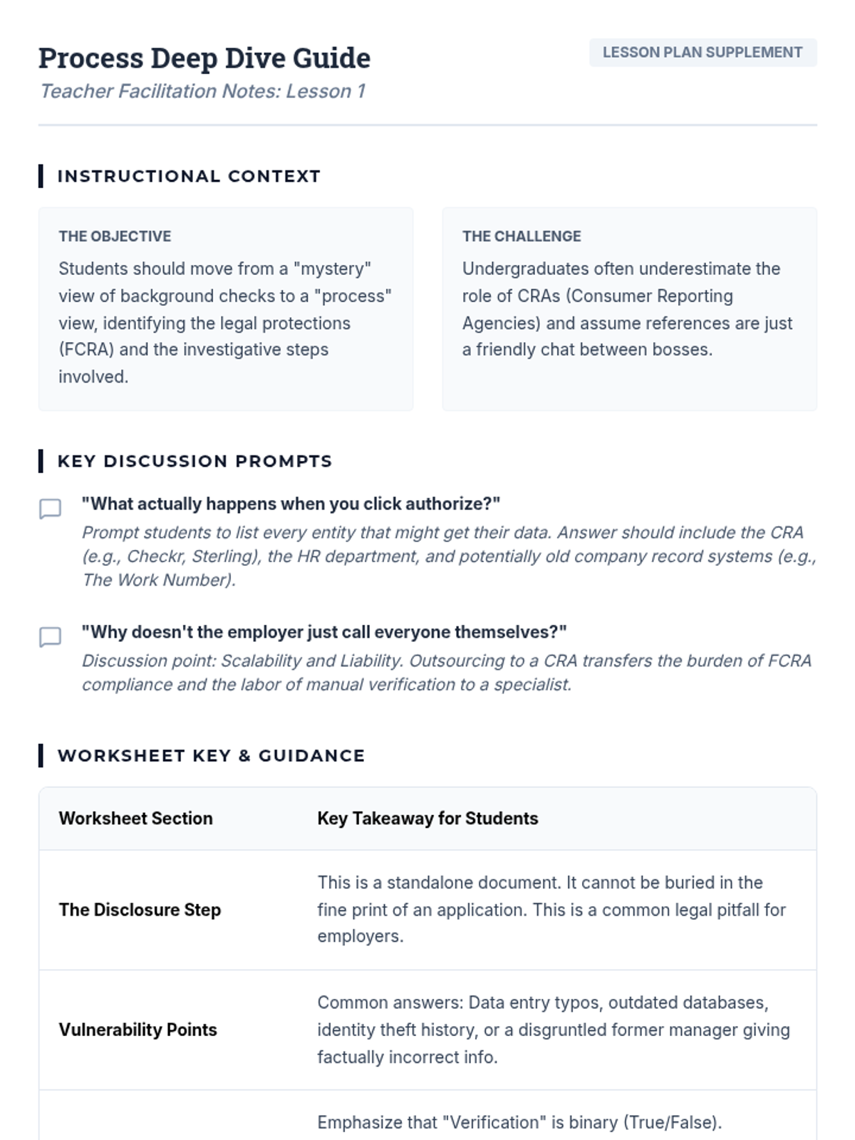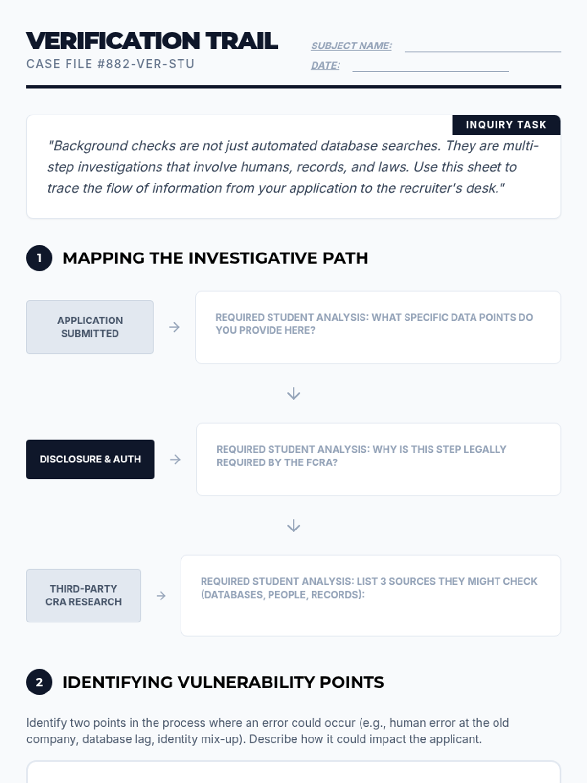 This sequence for undergraduate students explores the legal, ethical, and investigative aspects of professional references and background checks. It prepares students for corporate and government hiring through a flipped classroom model focused on rights, responsibilities, and professional integrity.