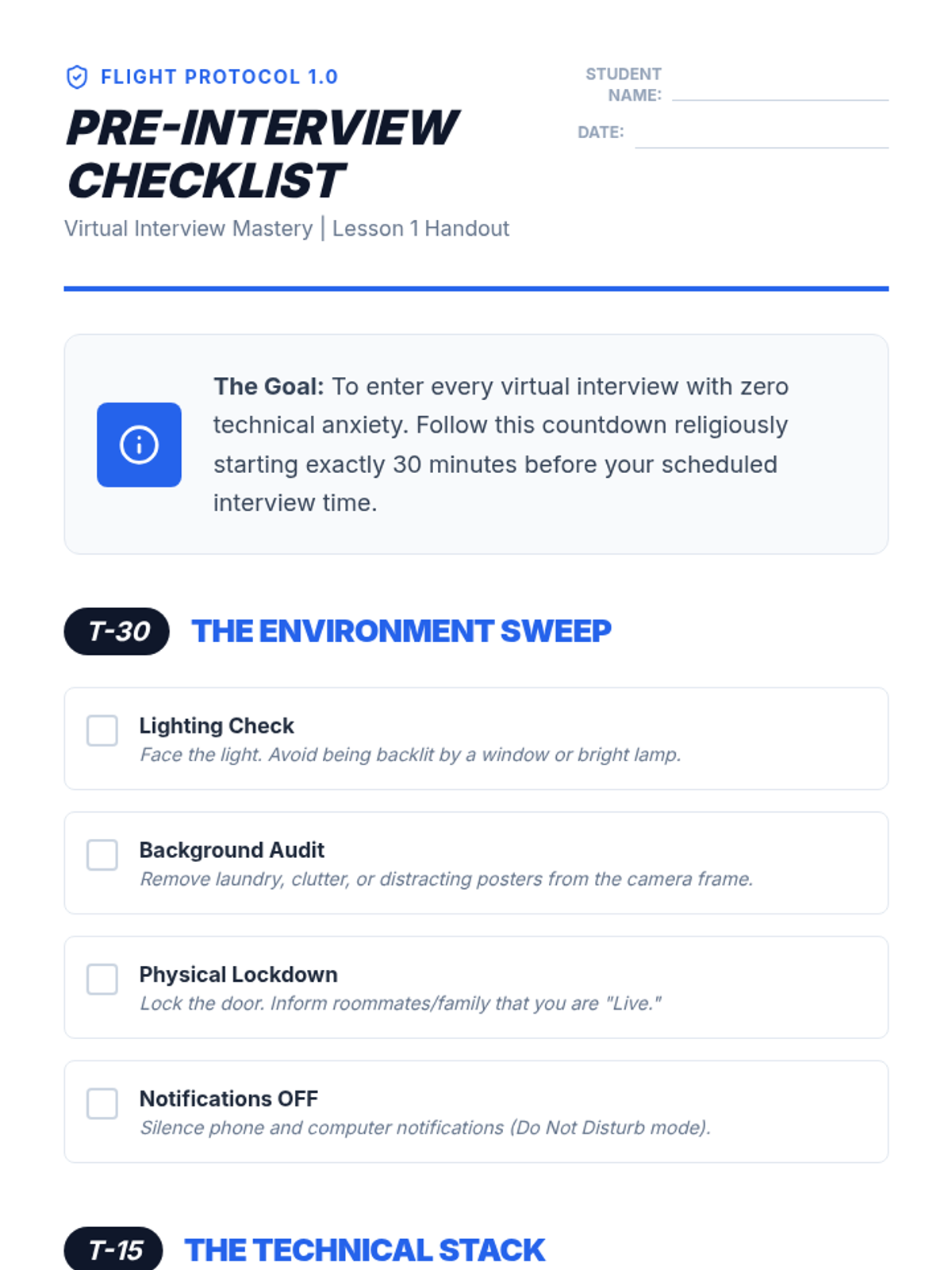A comprehensive training sequence for undergraduate students to master virtual interview skills, moving from technical setup to high-stakes simulation and self-reflection. Students build a 'Screen Ready' mindset, ensuring they are technically flawless and behaviorally engaging in digital environments.