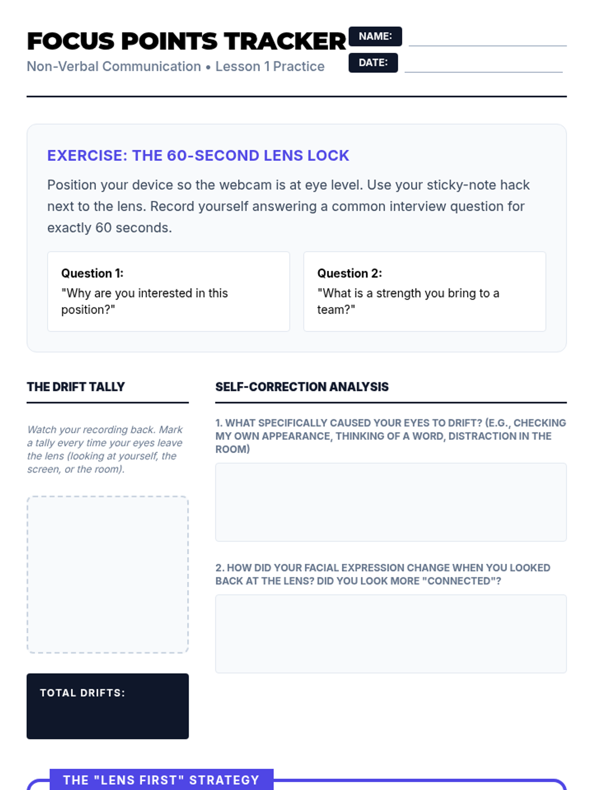 A comprehensive training program for graduate students to master non-verbal communication in virtual interviews. The sequence covers eye contact, framing, digital active listening, vocal modulation, and self-critique using video playback.