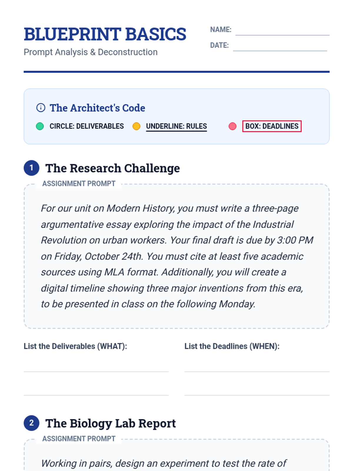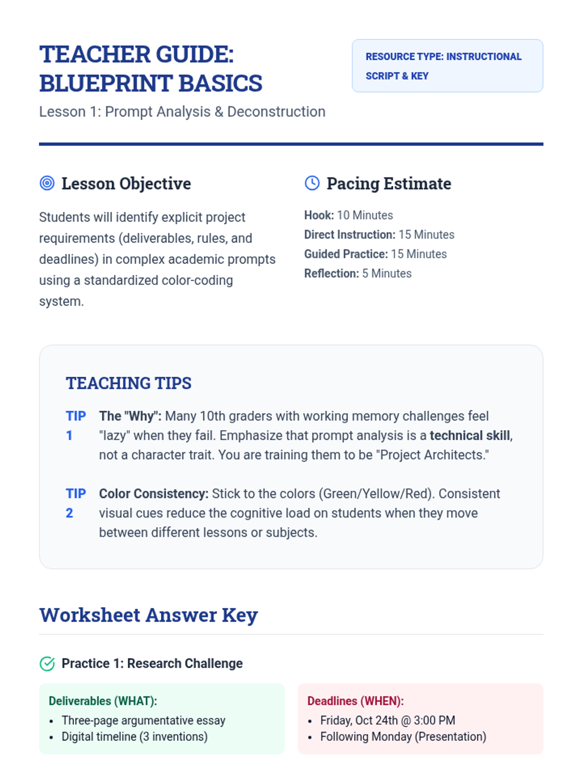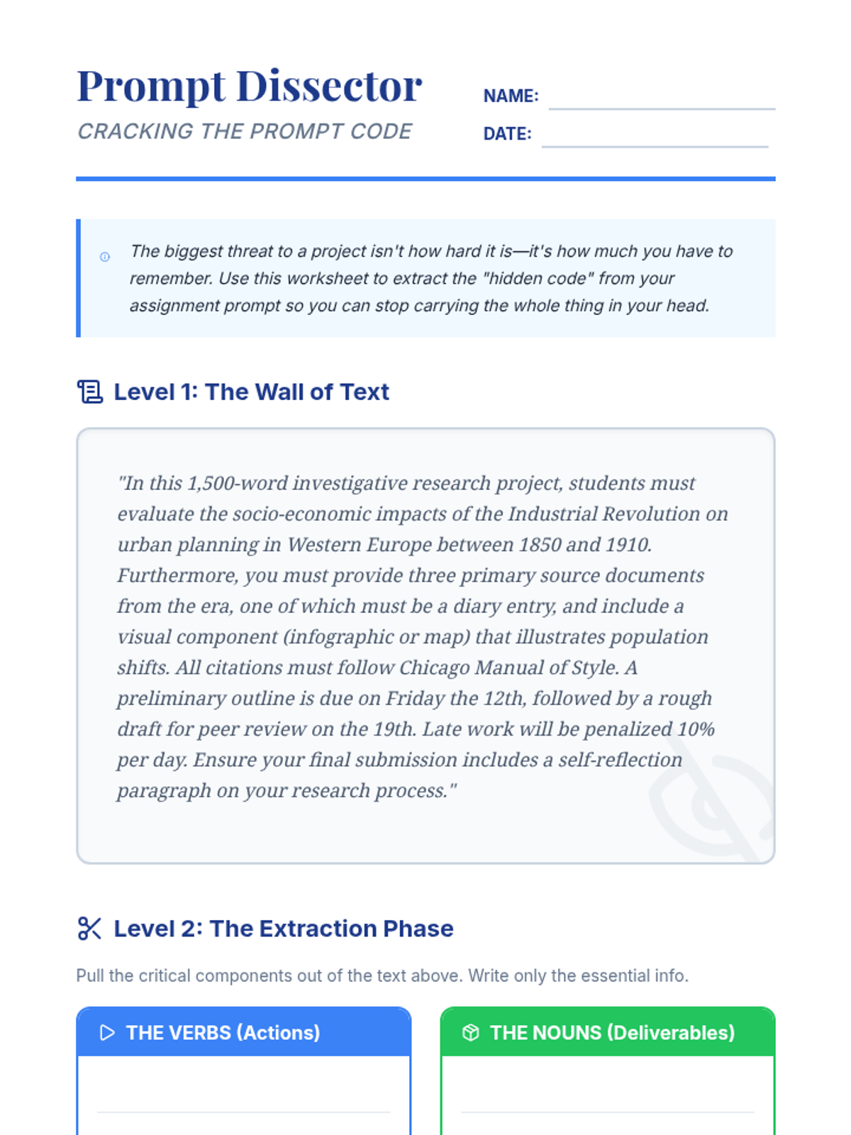 A 5-lesson workshop sequence for 11th-grade students designed to manage working memory load by deconstructing complex academic projects. Students learn to analyze multi-part prompts, backward plan from deadlines, visualize final products, and build external tracking systems.