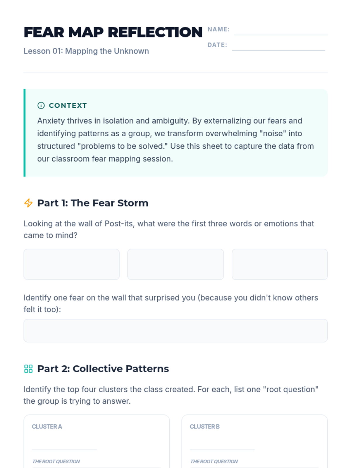 A project-based sequence for undergraduate students using Design Thinking to navigate post-graduation anxiety. Students collaborate to prototype future paths and build a collective resource repository.