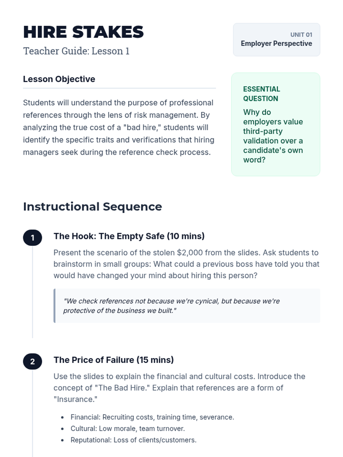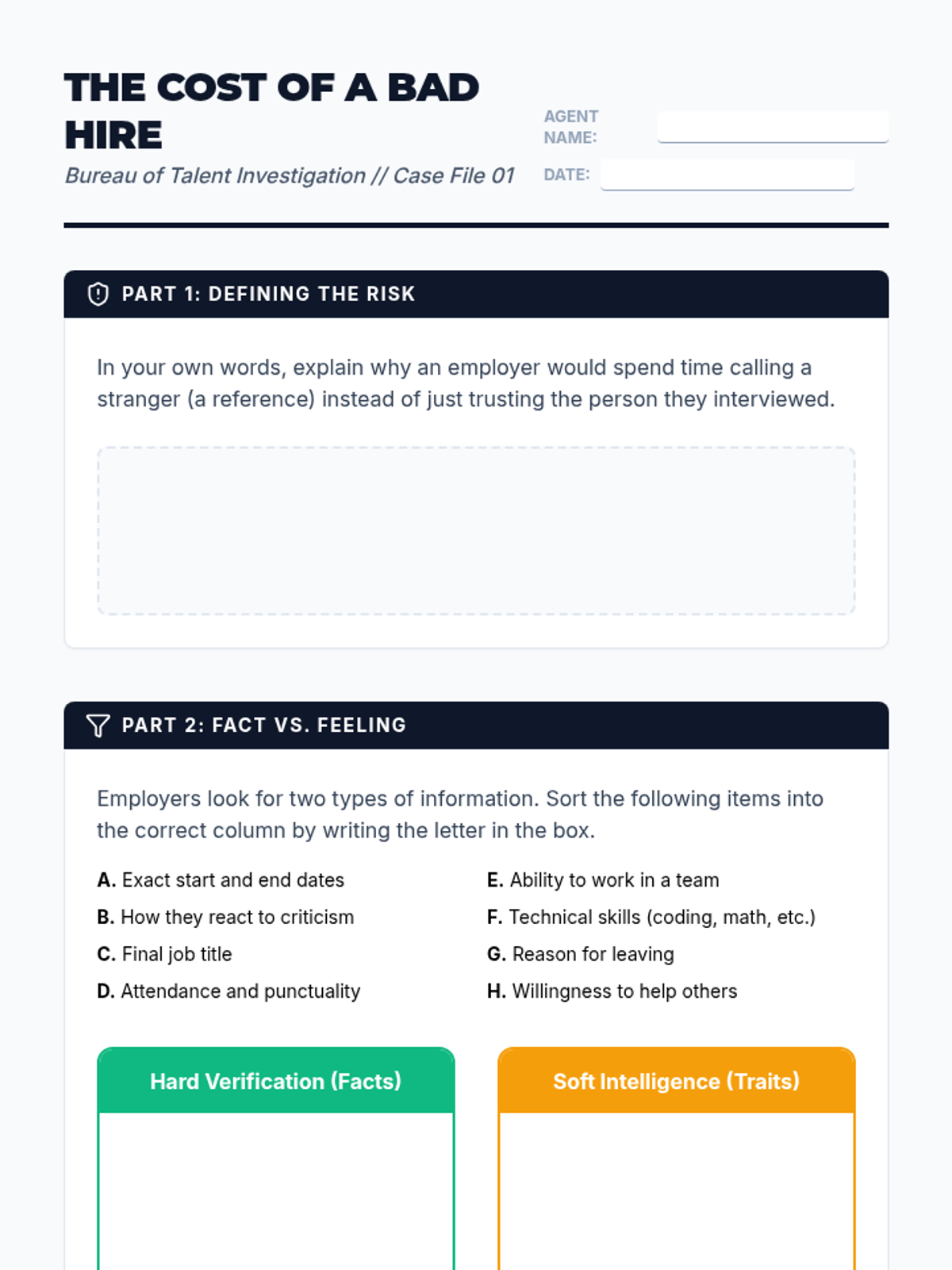 A 9th-grade sequence that flips the script on professional references, teaching students to evaluate candidates from an employer's perspective. Students analyze risk, decode reference transcripts, and learn the strategic, legal, and ethical nuances of professional recommendations to better prepare their own future applications.
