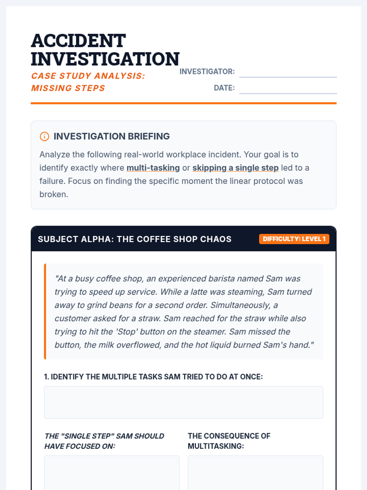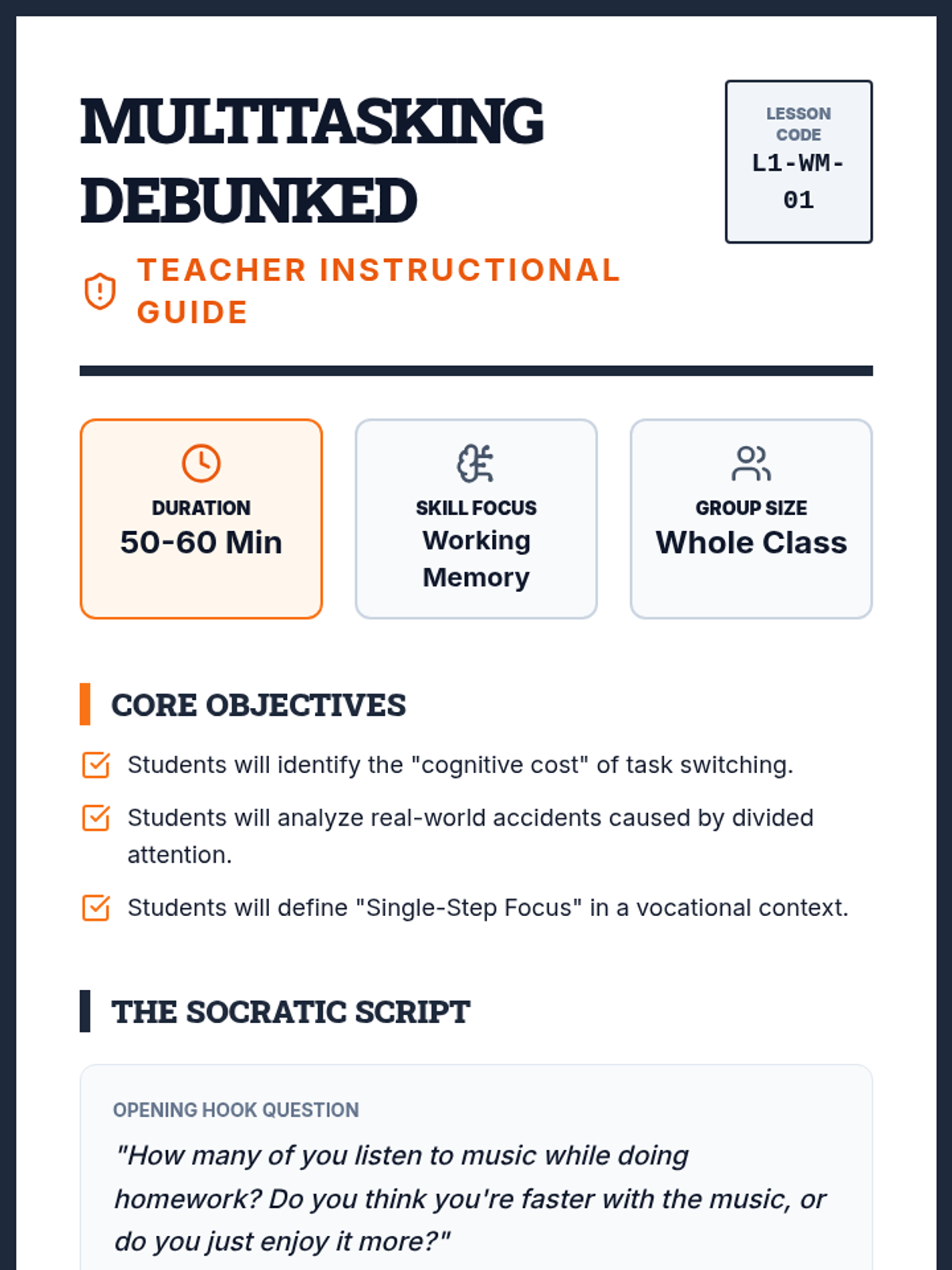 This sequence explores the critical importance of single-step focus in vocational environments. Students analyze how working memory limitations impact safety and quality, practicing sequential execution through industrial case studies, SOP development, and high-stakes simulations.