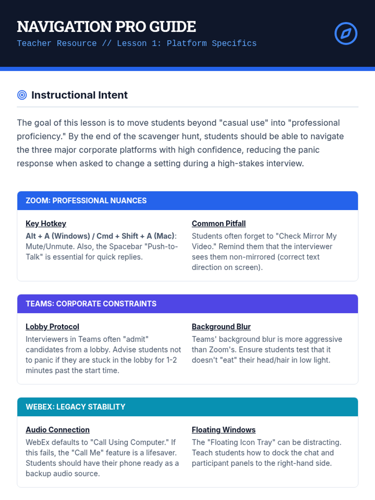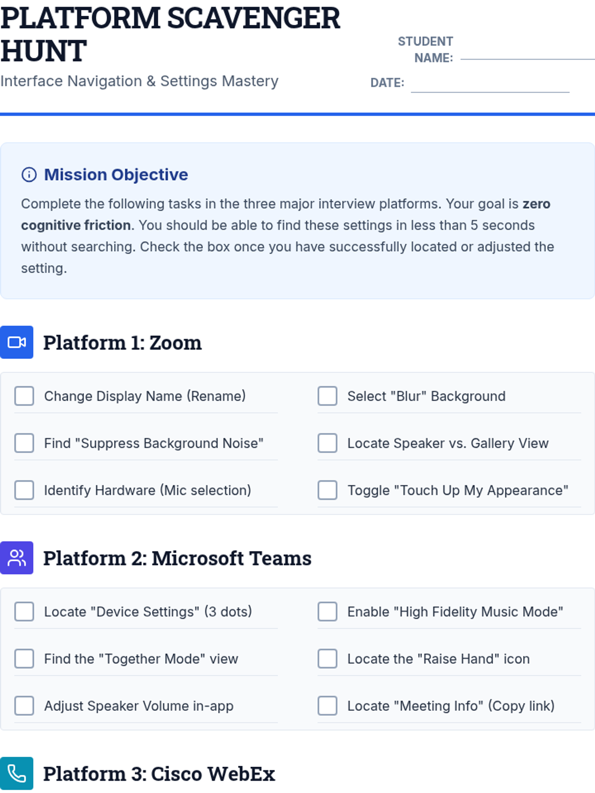 A comprehensive sequence for undergraduate students focused on mastering virtual interview platforms (Zoom, Teams, WebEx) and developing the resilience needed to handle technical failures with professional grace. Students move from platform fluency to real-time crisis management simulations.
