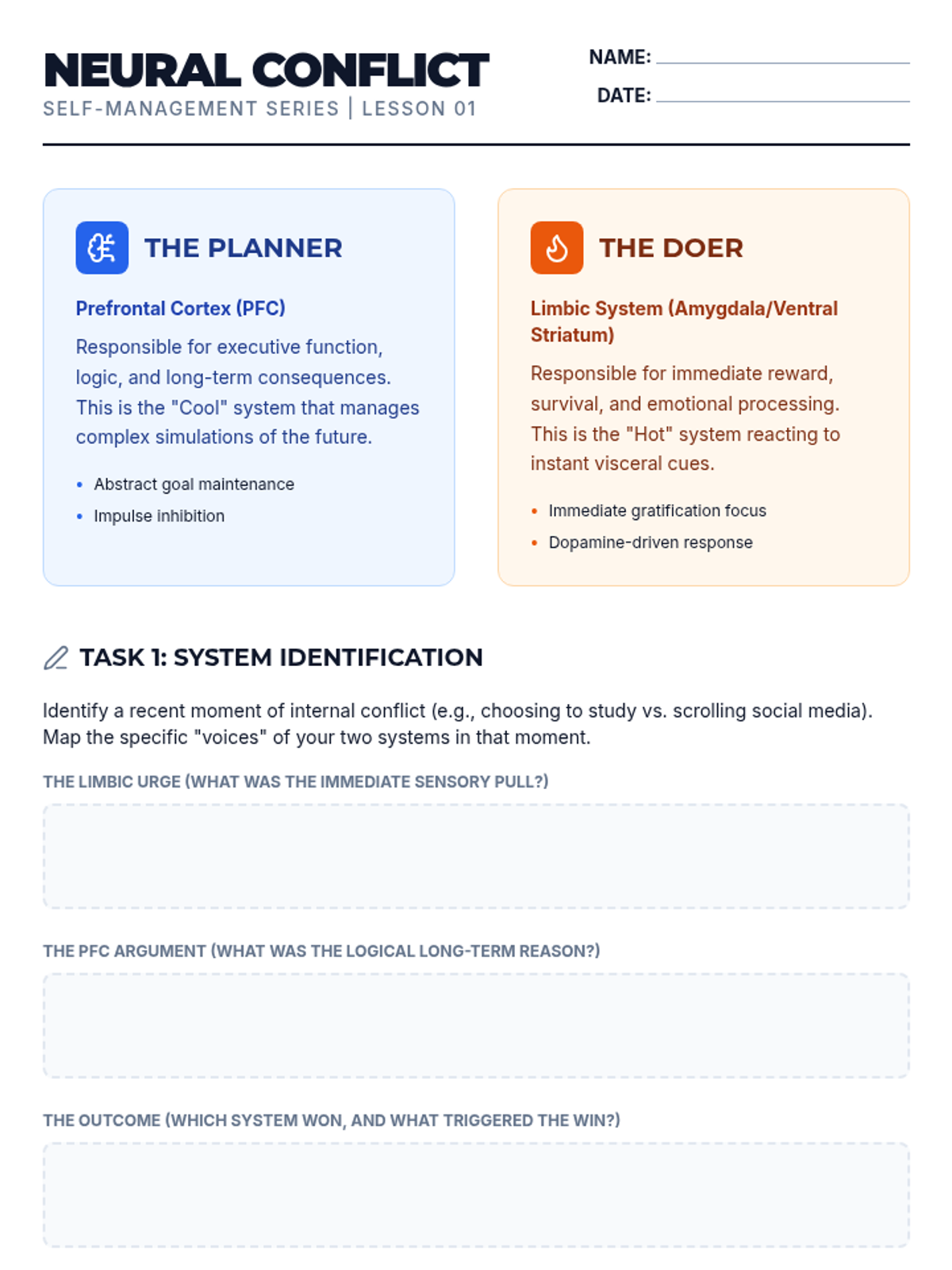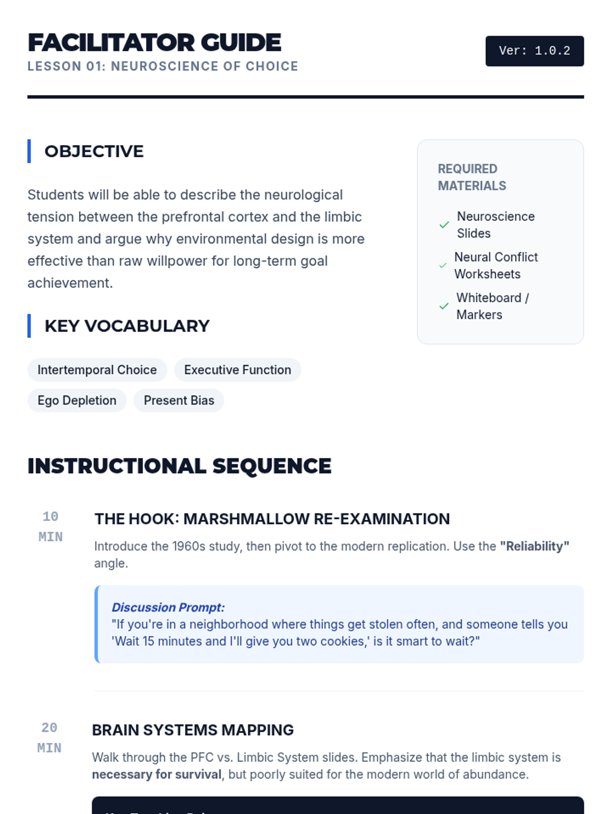 This sequence explores the psychological and neurological mechanisms of delayed gratification, moving beyond willpower to evidence-based strategies like commitment devices and environmental architecture. Students will analyze hyperbolic discounting, fMRI brain studies, and implementation intentions to build a personalized framework for long-term goal achievement.