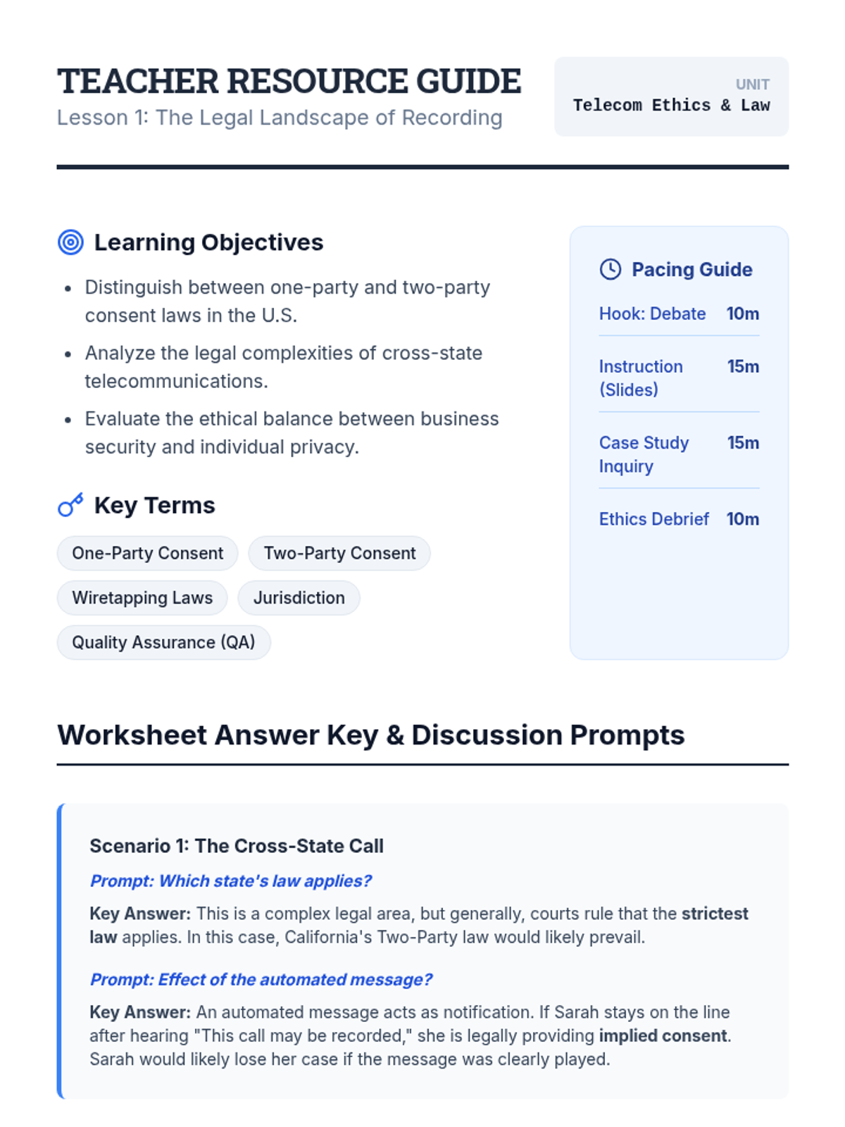 This inquiry-based sequence examines the legal, ethical, and reputation-based consequences of telephonic communication, moving from privacy laws to developing a personal code of ethics for the workplace.