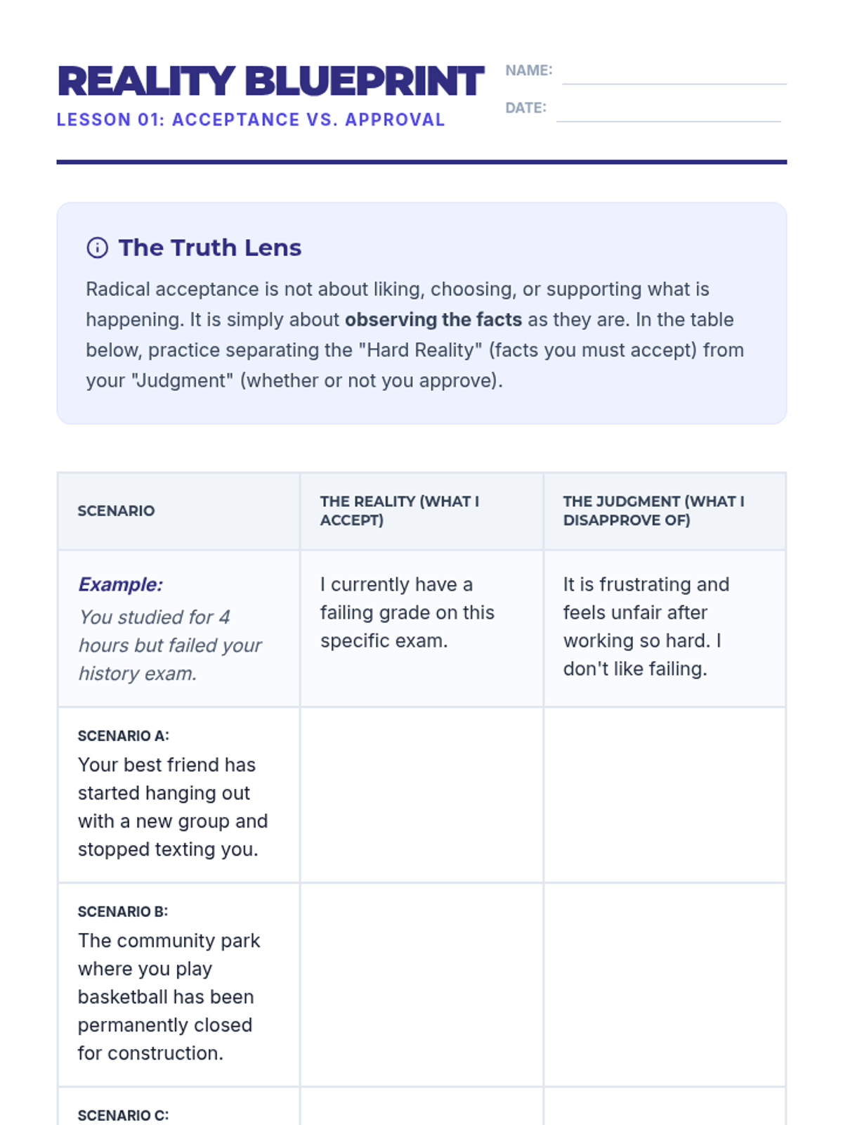 This sequence explores the psychological concept of Radical Acceptance, teaching students to distinguish between acceptance and approval. Students will analyze case studies, relationship dynamics, and civic advocacy to understand how acknowledging reality is the first step toward effective change.