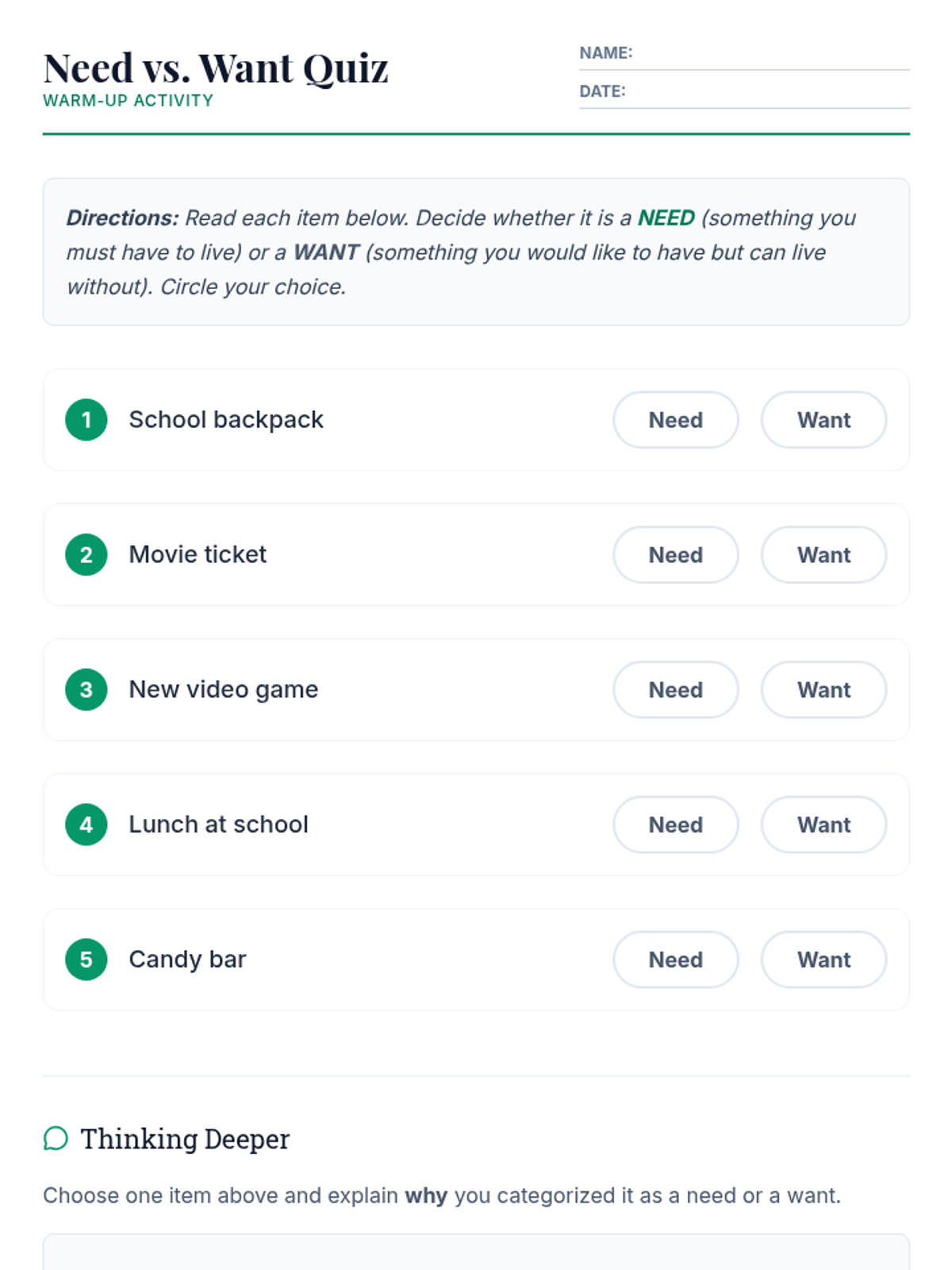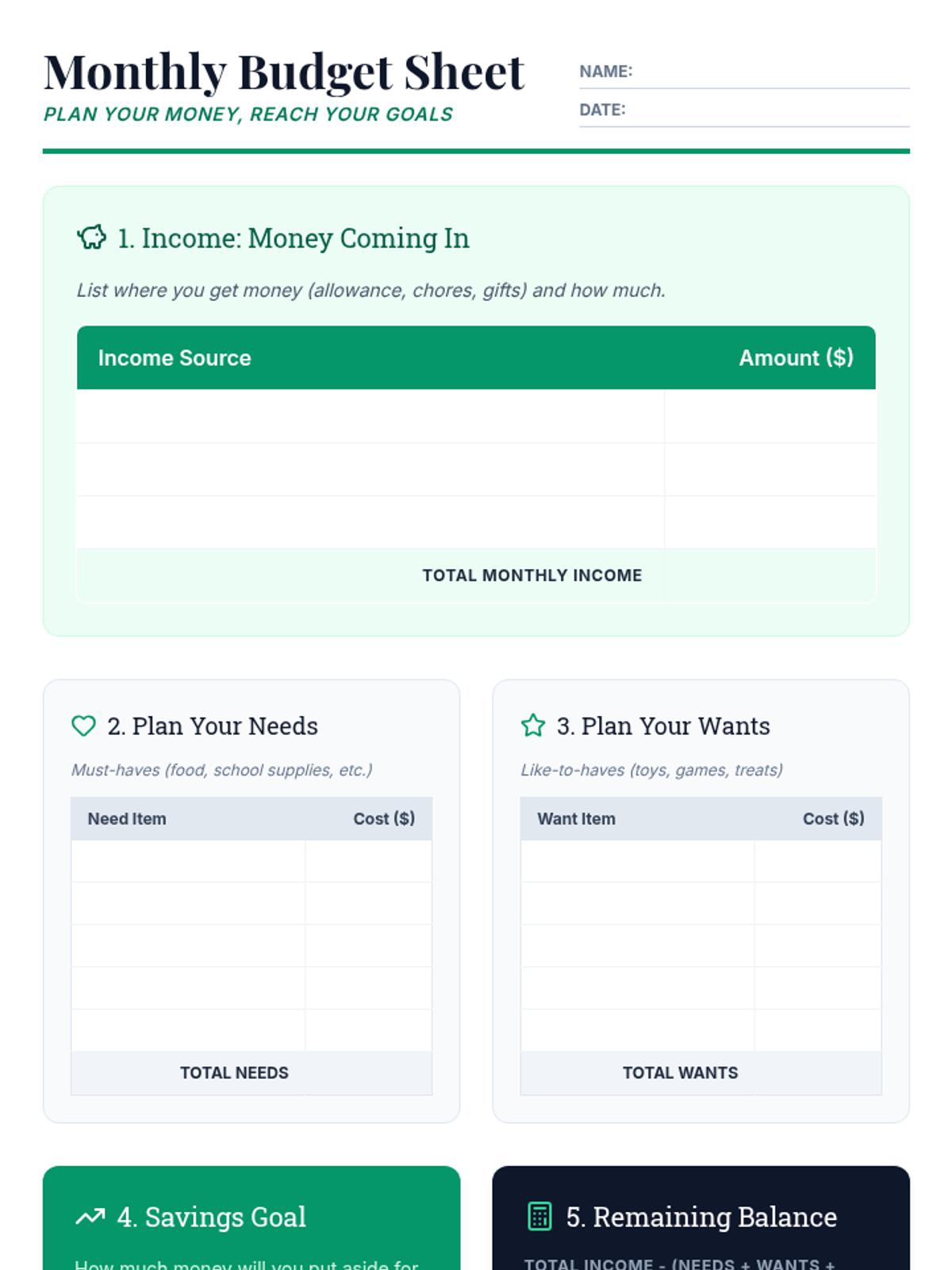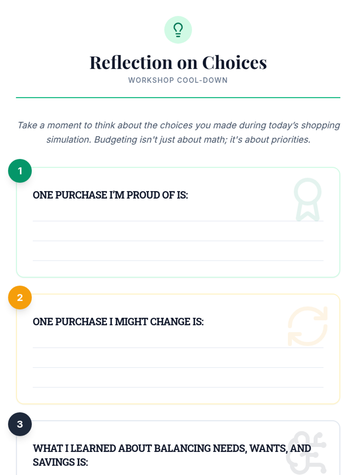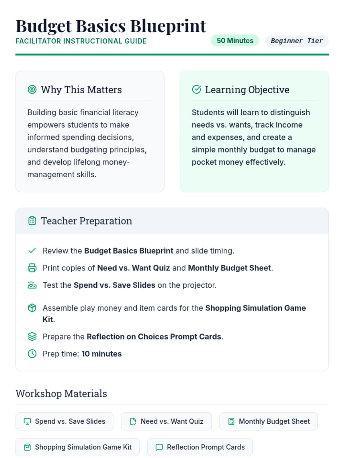 A comprehensive financial literacy sequence designed to take students from basic money concepts to advanced budgeting, goal setting, and investment basics. Suitable for diverse learners in a workshop setting.