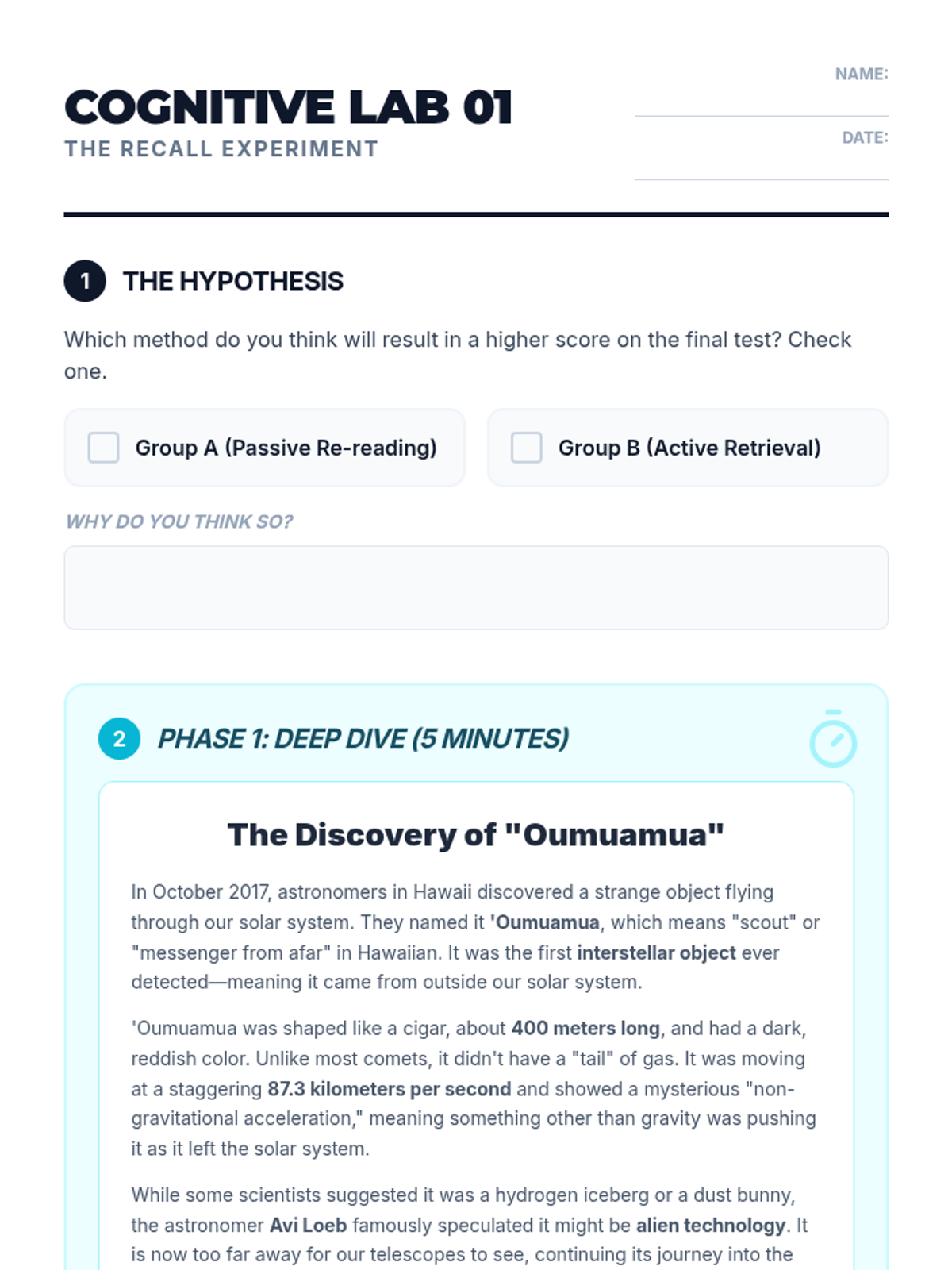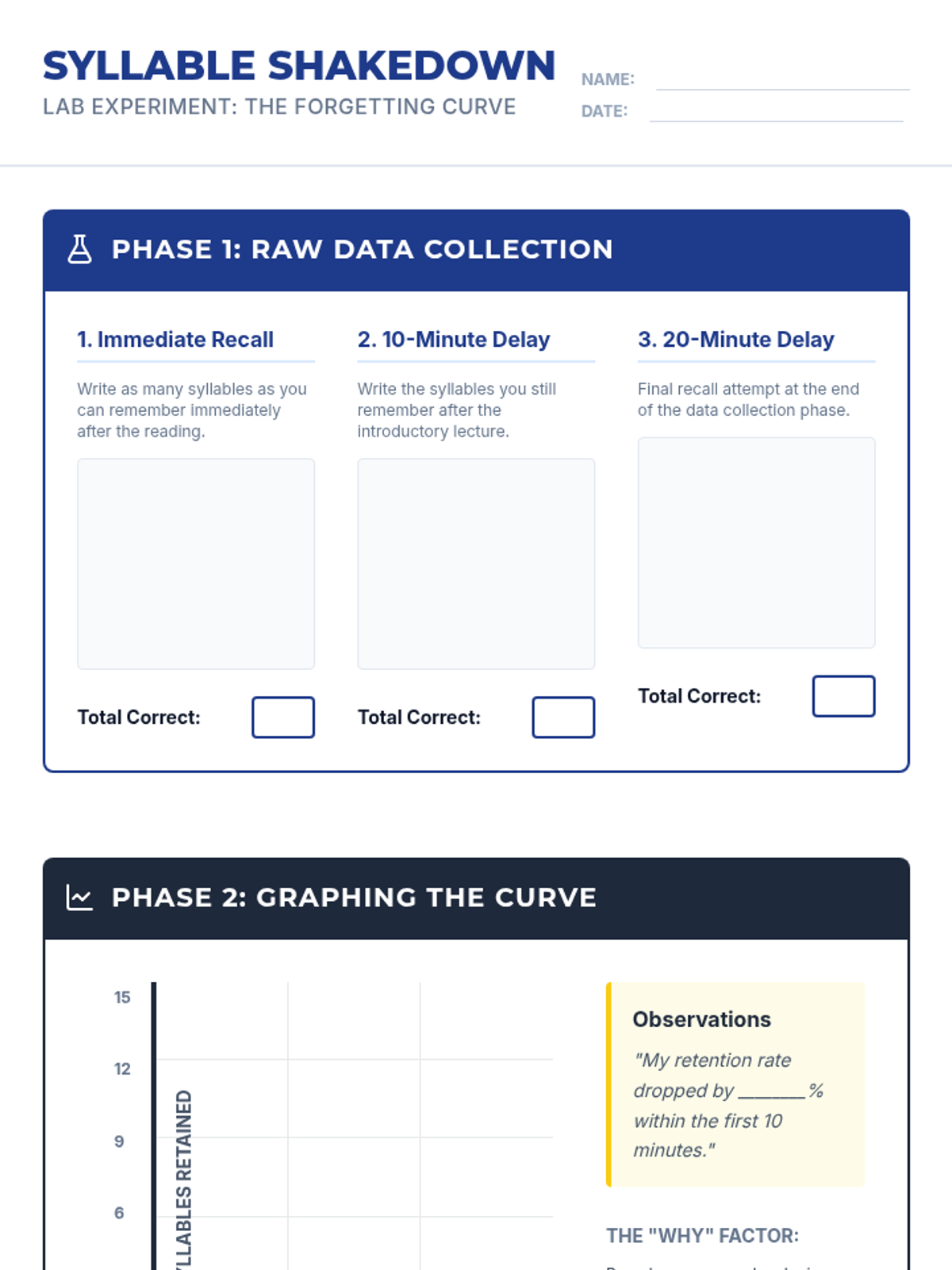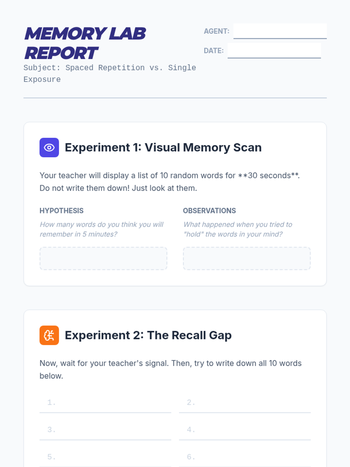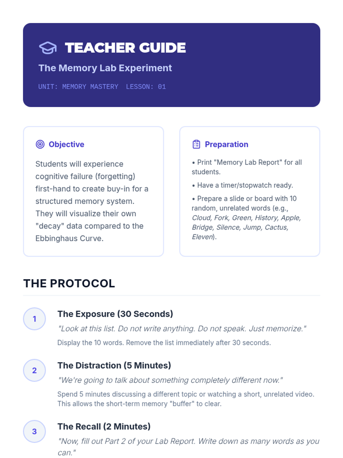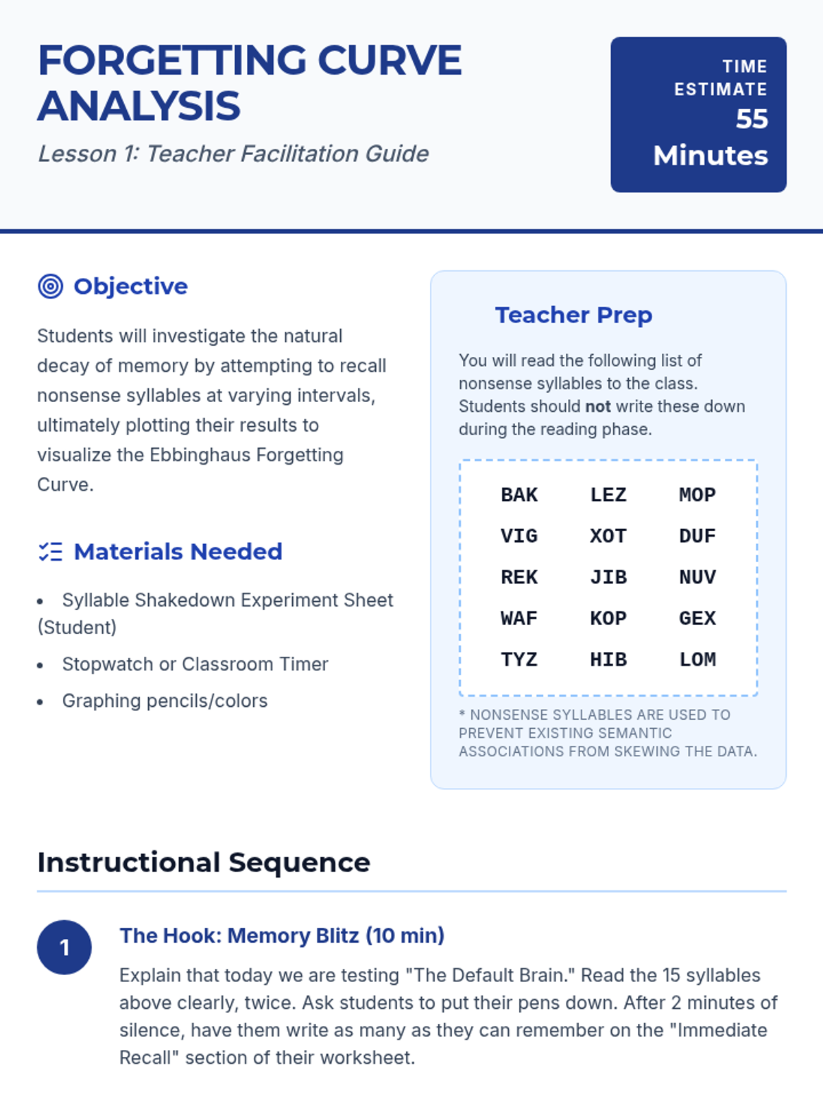 An inquiry-based exploration into the neuroscience of memory, focusing on the Forgetting Curve and how spaced repetition can 'hack' the brain for long-term retention. Students move from understanding memory decay to designing their own efficient study schedules based on biological principles.