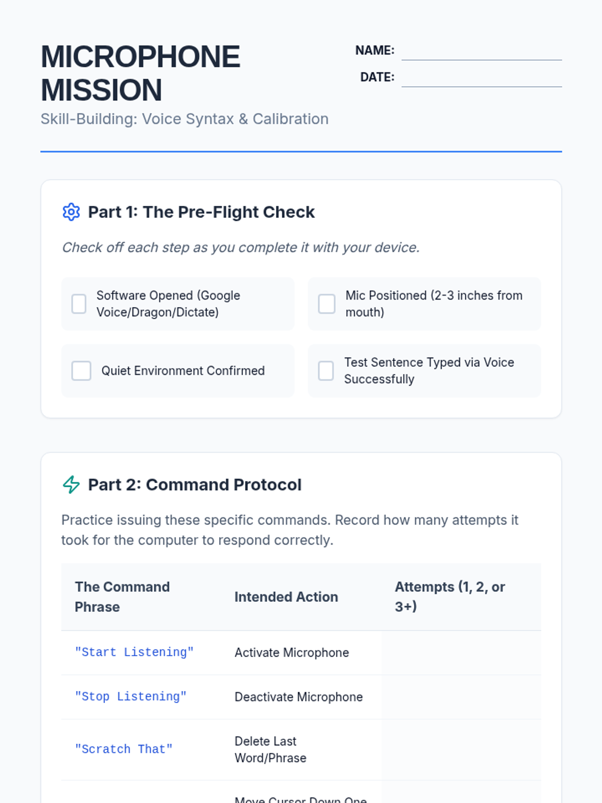 A comprehensive sequence for 11th-grade students to master speech-to-text technology, focusing on voice commands, punctuation syntax, and hands-free document formatting. Students transition from basic dictation to precise cursor control and layout management.