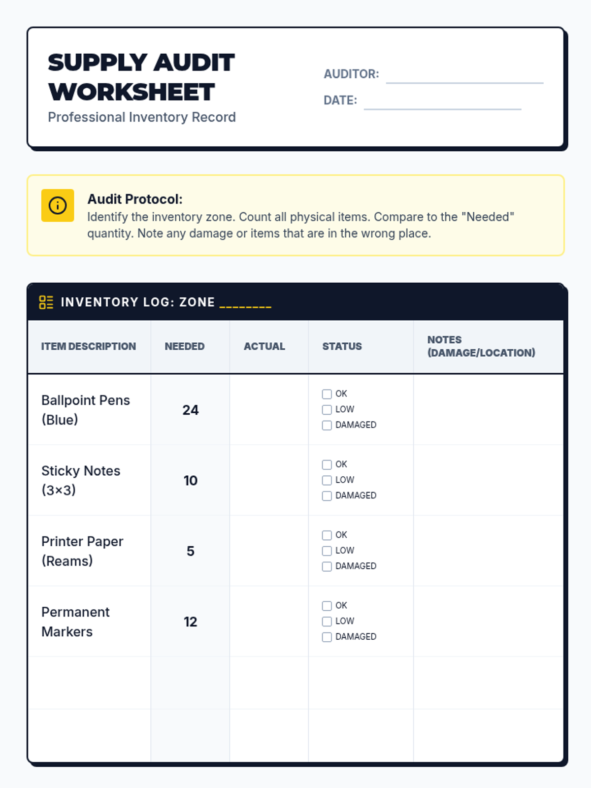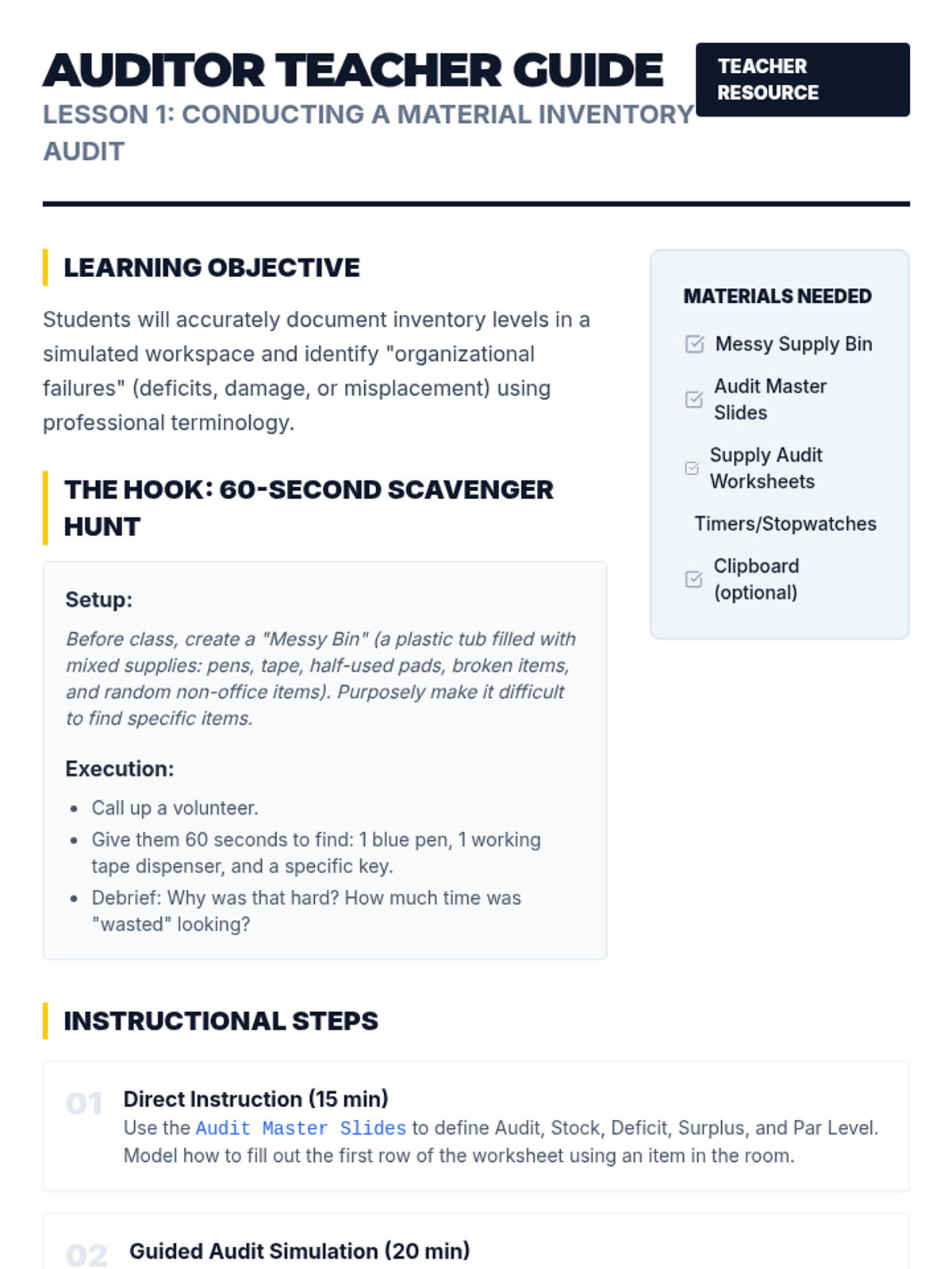 This vocational sequence prepares 12th-grade students for workplace success by teaching systematic physical organization, inventory auditing, and maintenance strategies. Students move from assessing current states to designing and implementing efficient material management systems.