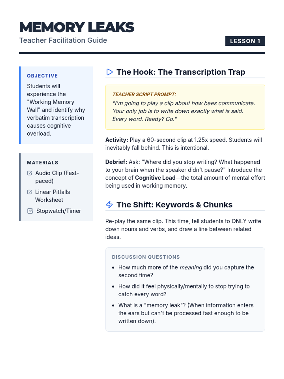 A 5-lesson workshop sequence for 11th-grade students designed to manage working memory load by deconstructing complex academic projects. Students learn to analyze multi-part prompts, backward plan from deadlines, visualize final products, and build external tracking systems.