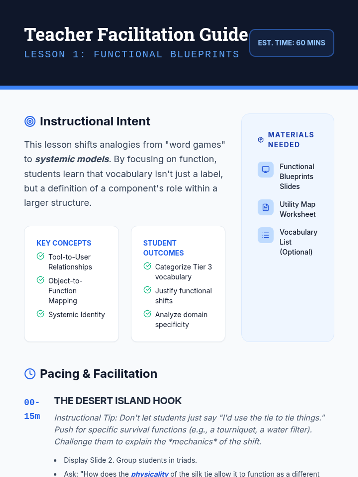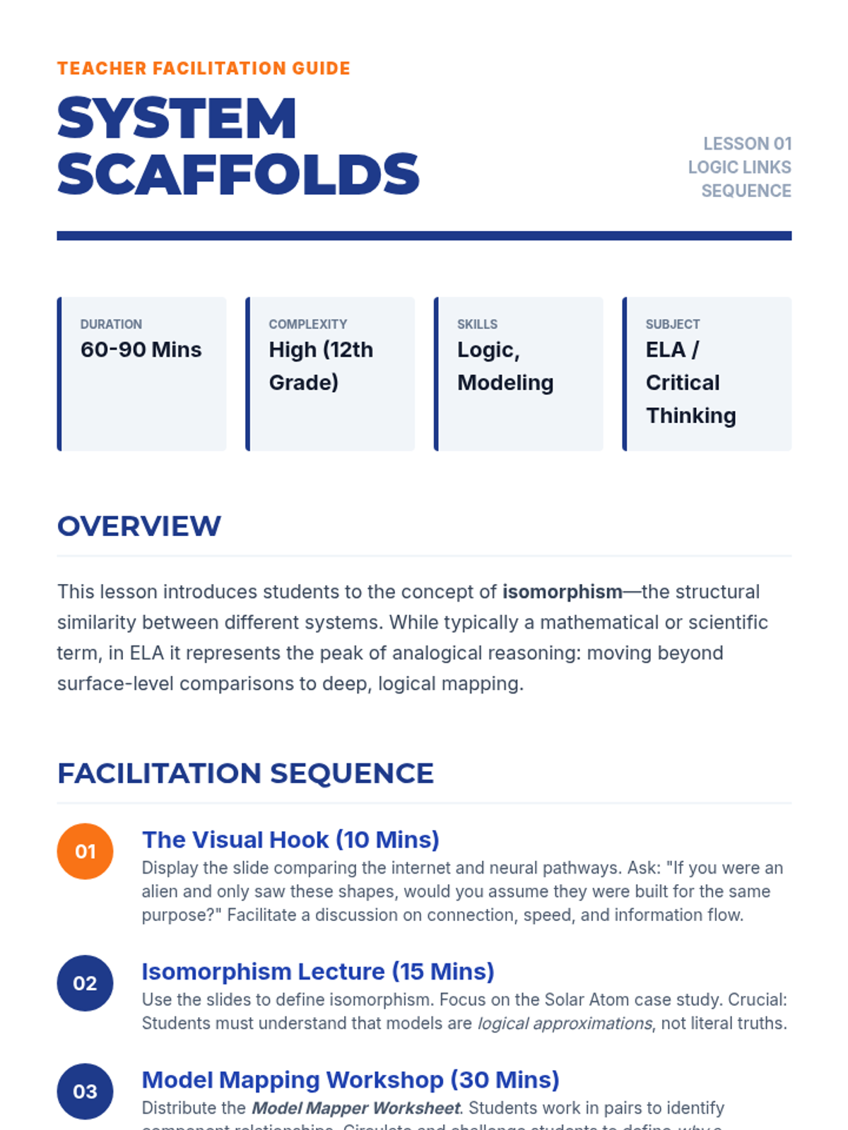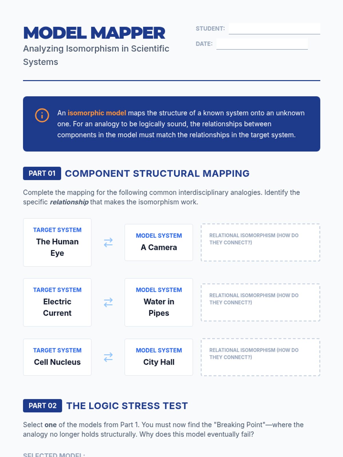 A high-level ELA sequence for 11th grade that explores analogies as cognitive models for complex systems across biology, physics, and history. Students progress from basic functional relationships to constructing and defending interdisciplinary models.