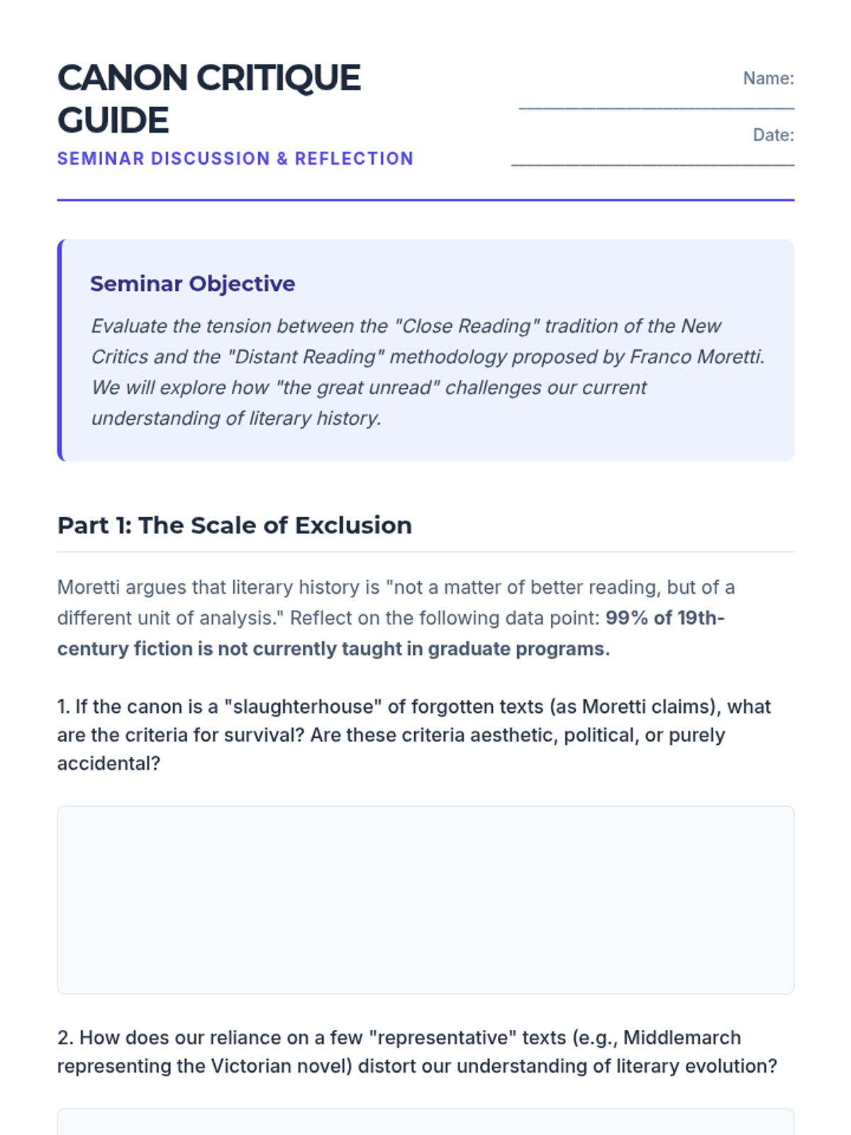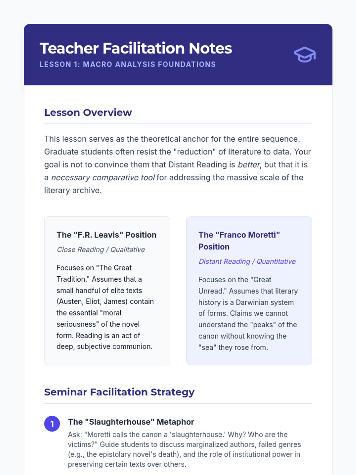A graduate-level sequence exploring Digital Humanities (DH) methodologies for comparative literary analysis. Students progress from theoretical foundations of 'distant reading' to practical applications in stylometry, topic modeling, and network analysis, culminating in the integration of computational data with traditional critical theory.