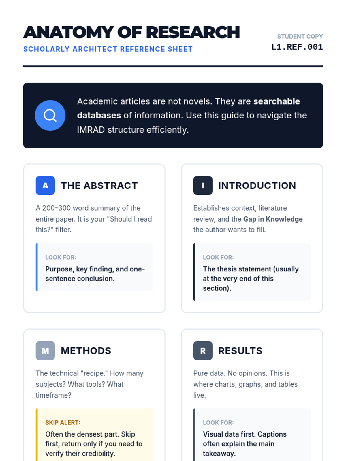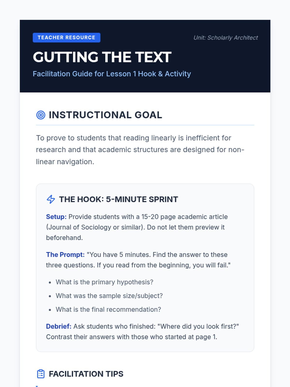 A comprehensive sequence for 12th Grade students to transition from passive reading to active synthesis of multiple academic sources. Students learn to deconstruct academic papers, annotate critically, paraphrase ethically, and organize findings into a thematic literature review matrix.