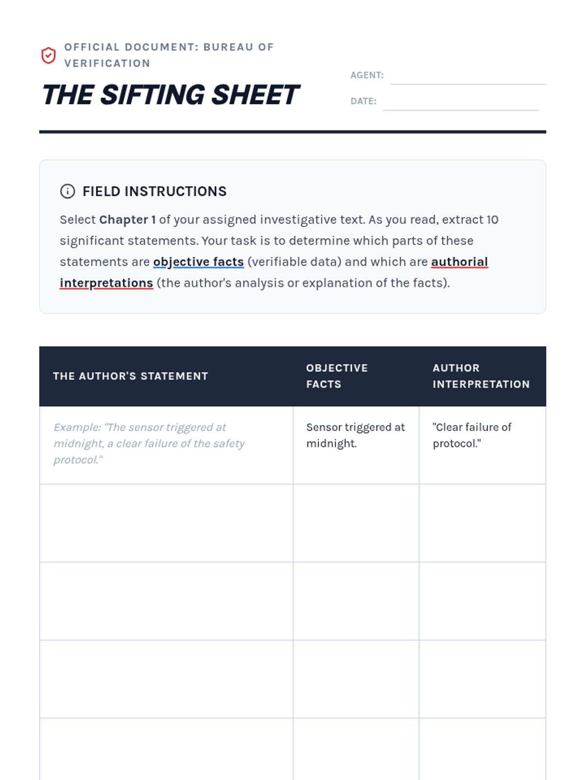 A 10th-grade ELA sequence focused on critical reading and source evaluation in investigative nonfiction. Students learn to separate fact from interpretation, verify citations, and conduct comprehensive validity audits.