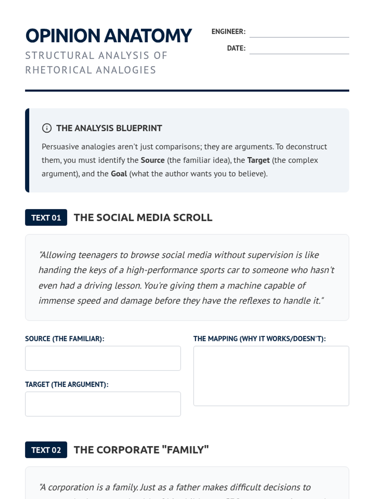 A comprehensive unit for undergraduate students on analogical reasoning and comparative argumentation. The sequence moves from the structural mechanics of analogies to their critical application in law, policy, and ethics, culminating in a moot court simulation focused on case precedent.
