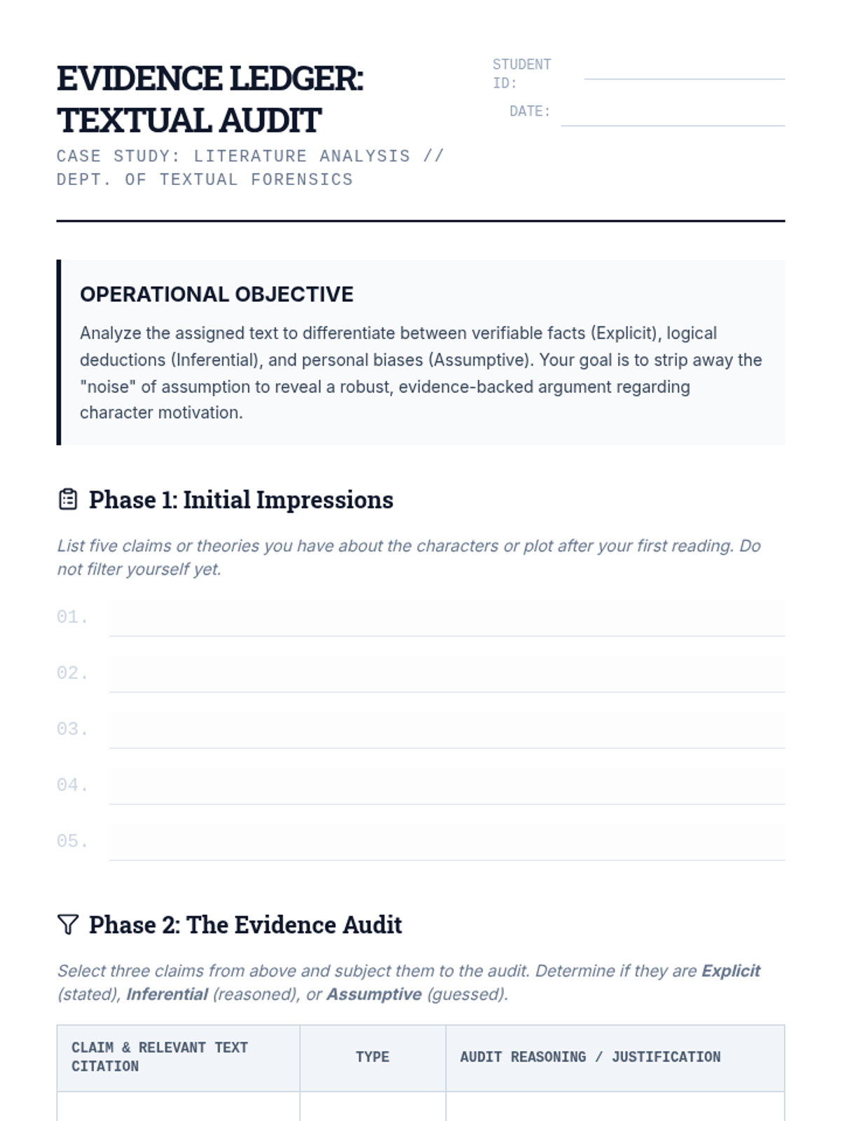 An advanced workshop for undergraduate students focusing on the mechanics of close reading, subtextual analysis, and the construction of evidence-based thematic arguments. Students progress from basic inference to analyzing complex narrative voices and synthesizing evidence into scholarly writing.