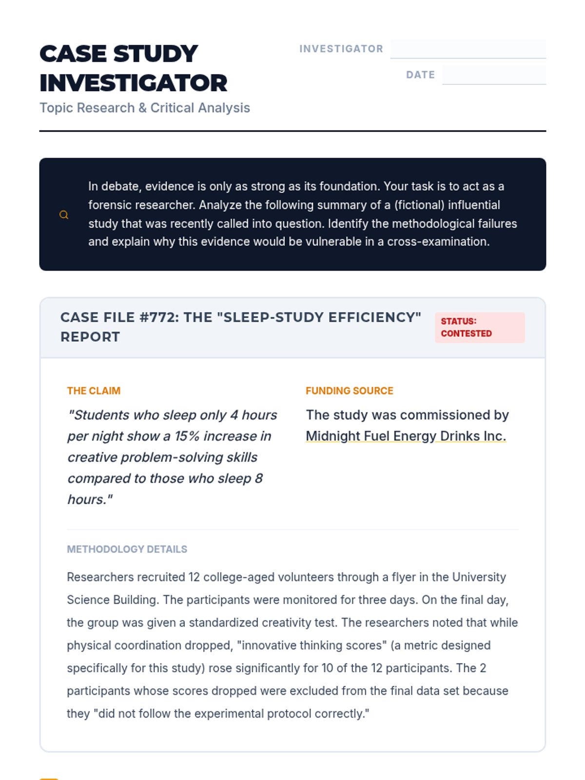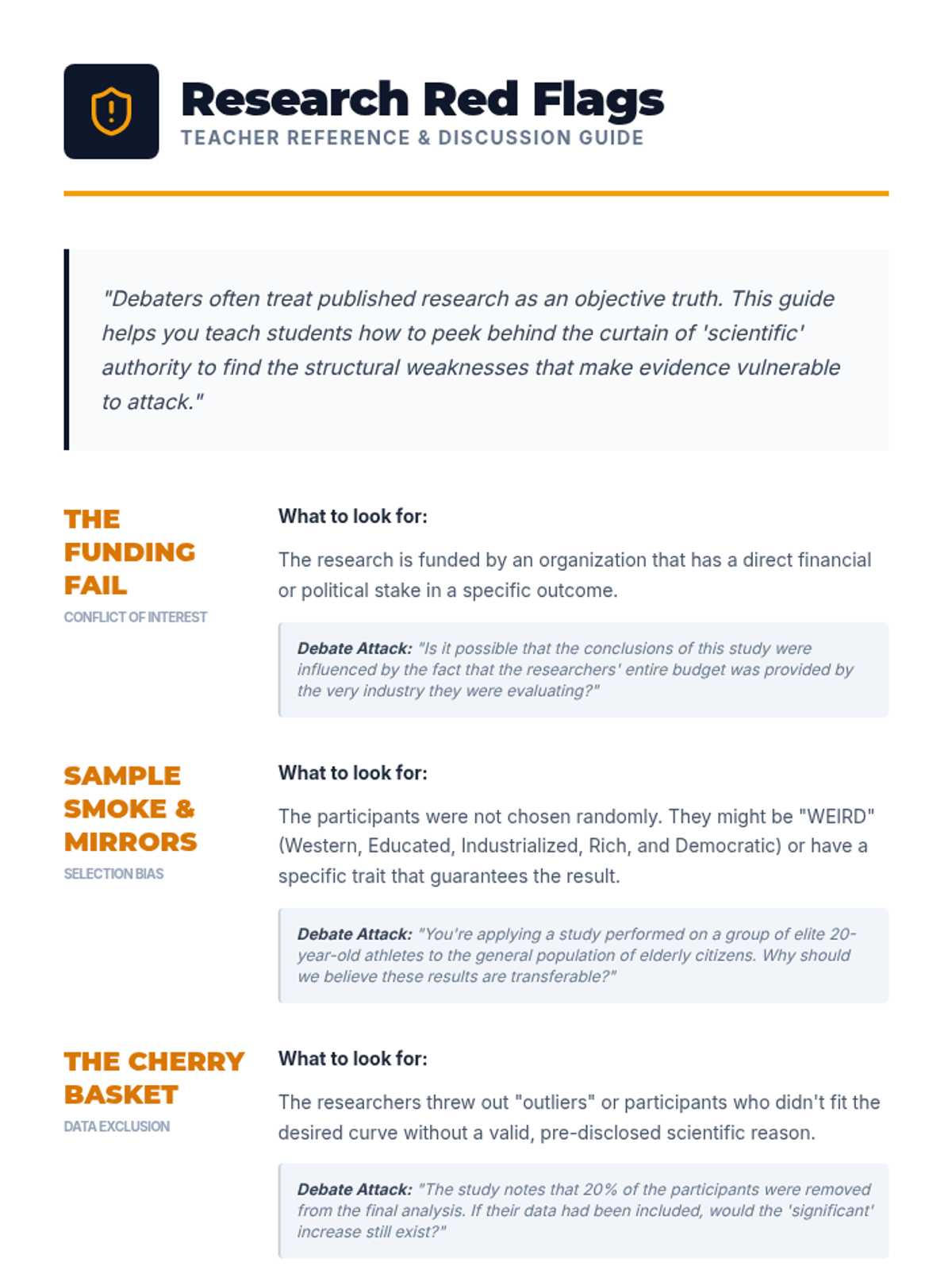 A 10th-grade ELA sequence focused on the critical analysis and deconstruction of opposing evidence in debate. Students learn to scrutinize research methodologies, identify logical fallacies like cherry-picking and contextomy, and develop sharp cross-examination skills to expose weaknesses in arguments.