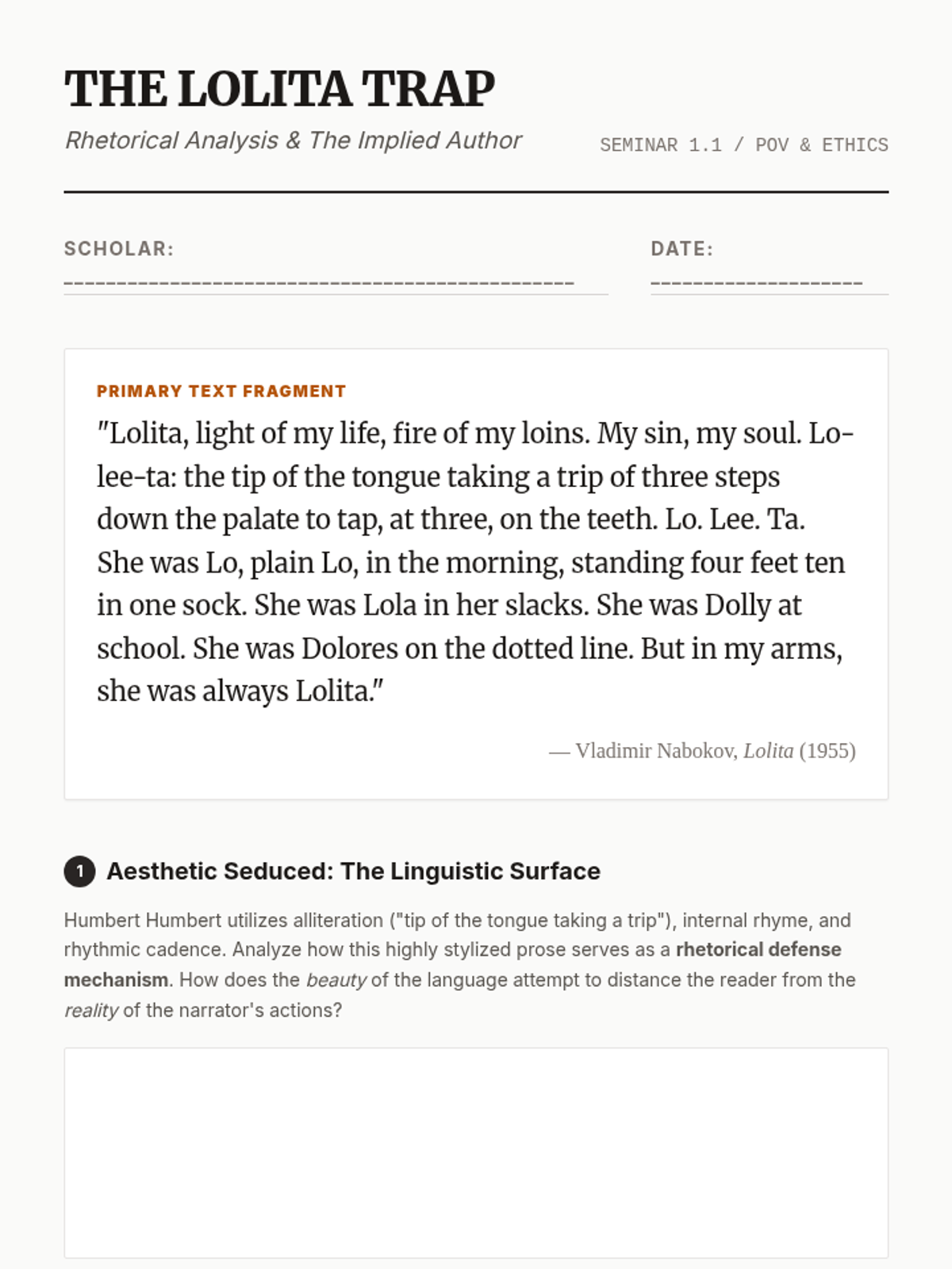 This sequence elevates novel study to a macro-level, requiring students to interpret text through various critical lenses (historical, feminist, Marxist, etc.). Students connect literature to broader societal issues and historical contexts, culminating in a critical analysis that situates the novel within a specific intellectual framework.