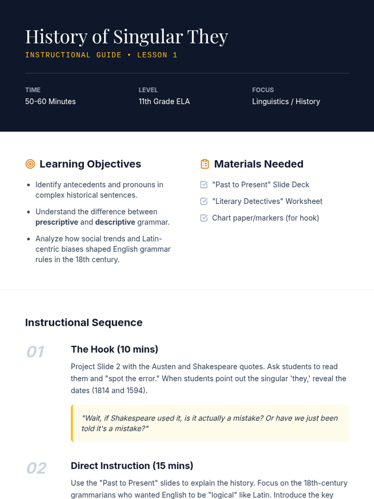This inquiry-based sequence explores the evolving nature of grammar, specifically addressing the debate around the singular 'they' and gender-neutral language. Students move from analyzing historical style guides to evaluating modern usage in journalism and academia.