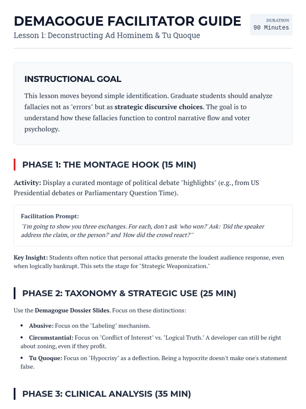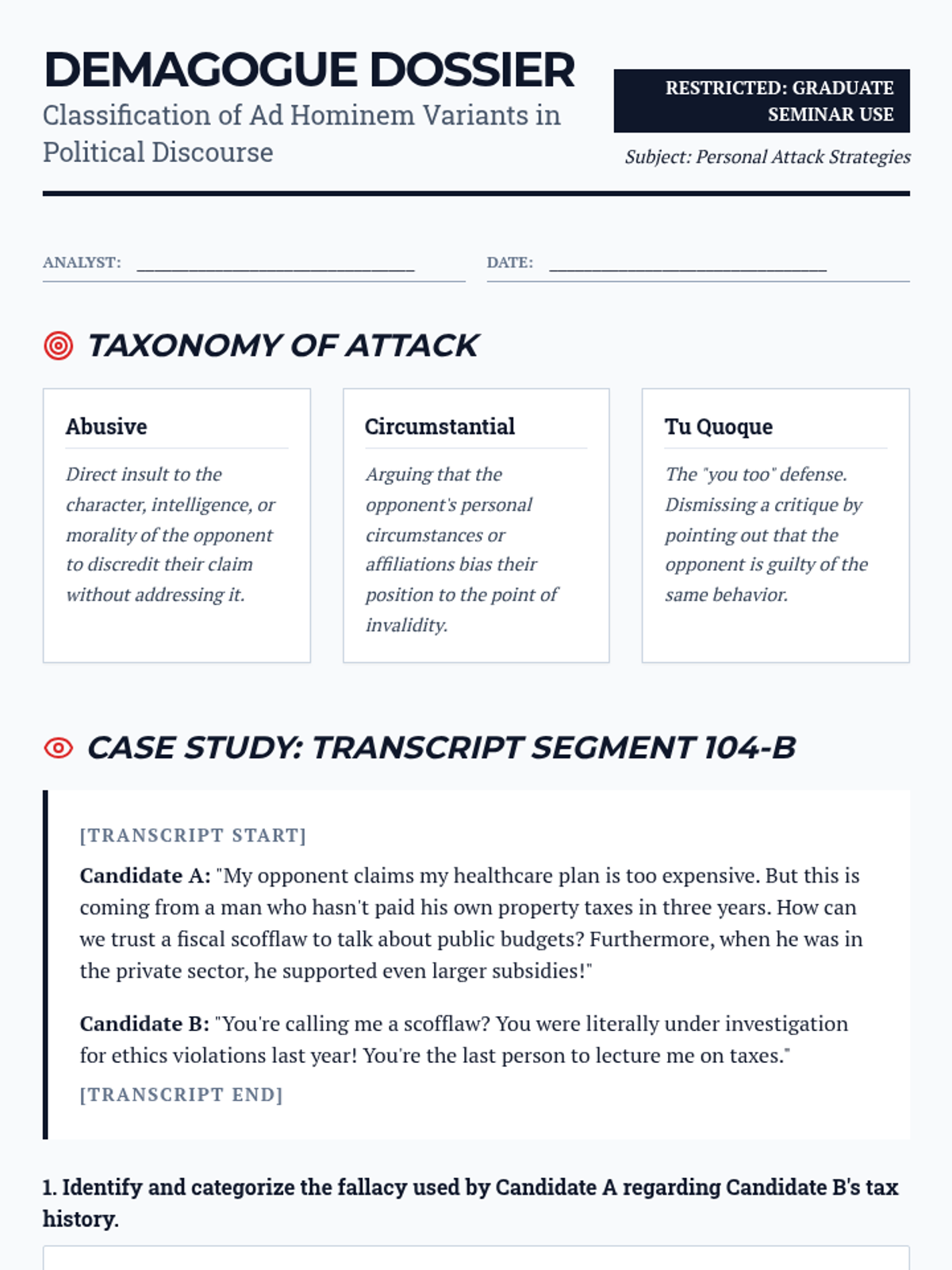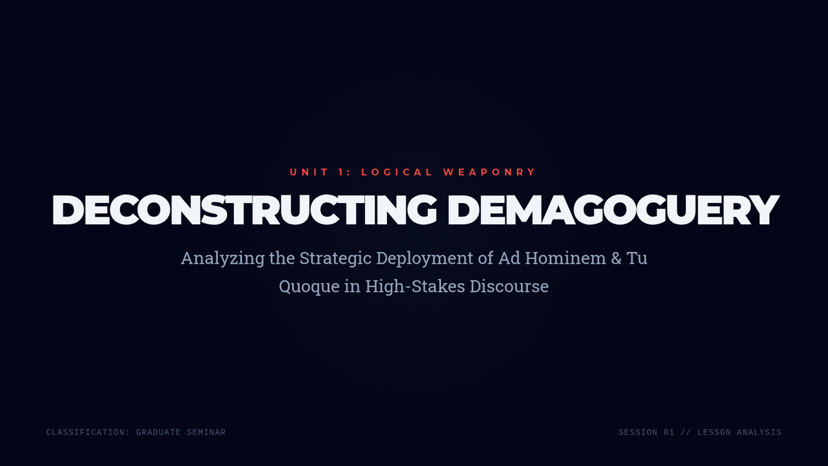 An advanced rhetorical analysis sequence for graduate students, focusing on the strategic deployment of logical fallacies in political, legal, and media discourse. Students deconstruct high-stakes communication to develop sophisticated media literacy and defensive argumentation skills.