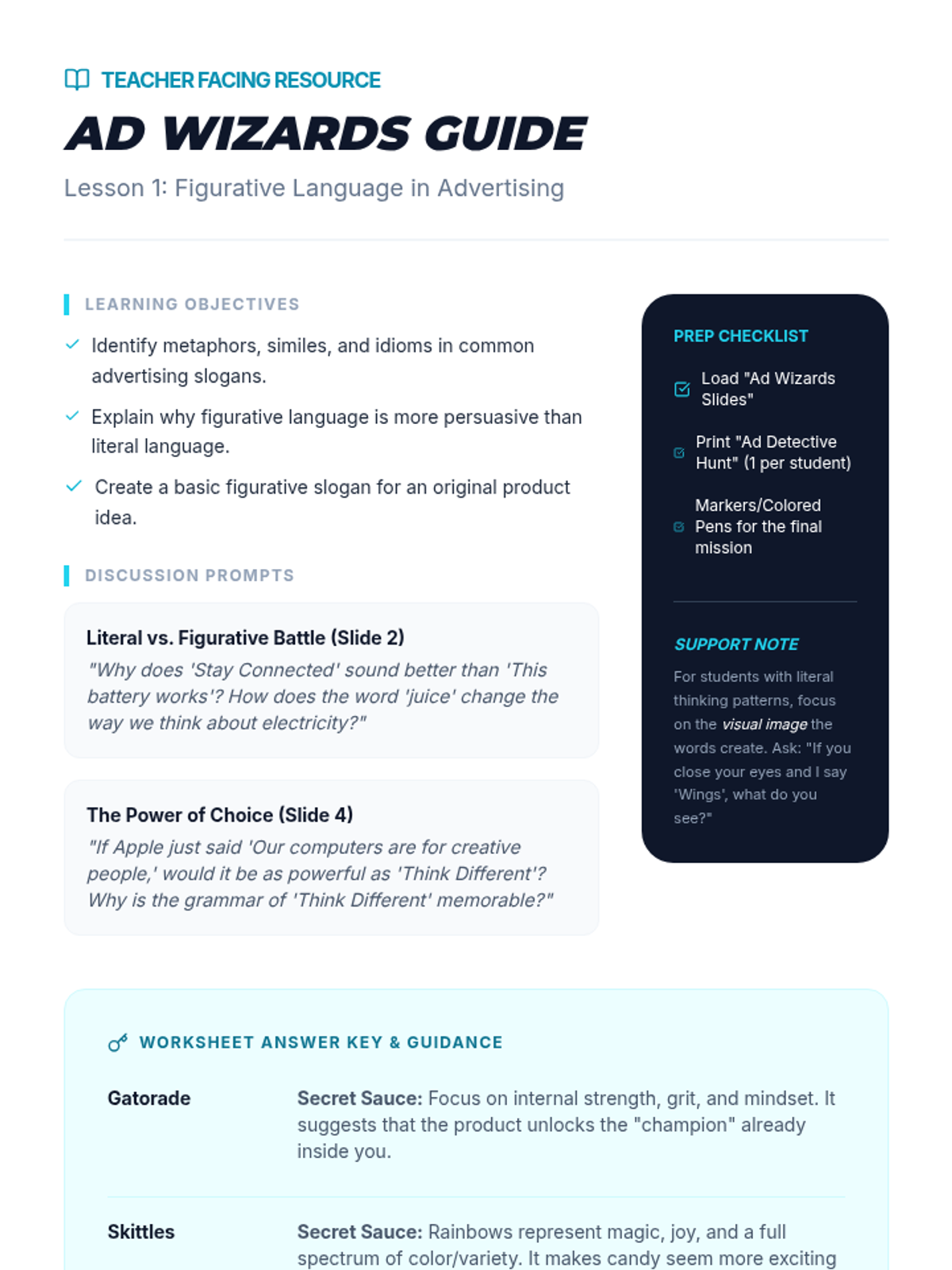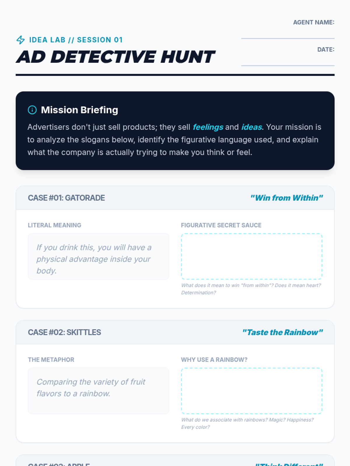 A high-school level sequence focused on social communication through the lens of figurative language. Students explore how idioms, metaphors, and similes are used in advertising, creative writing, and emotional expression, culminating in a persuasive pitch project.