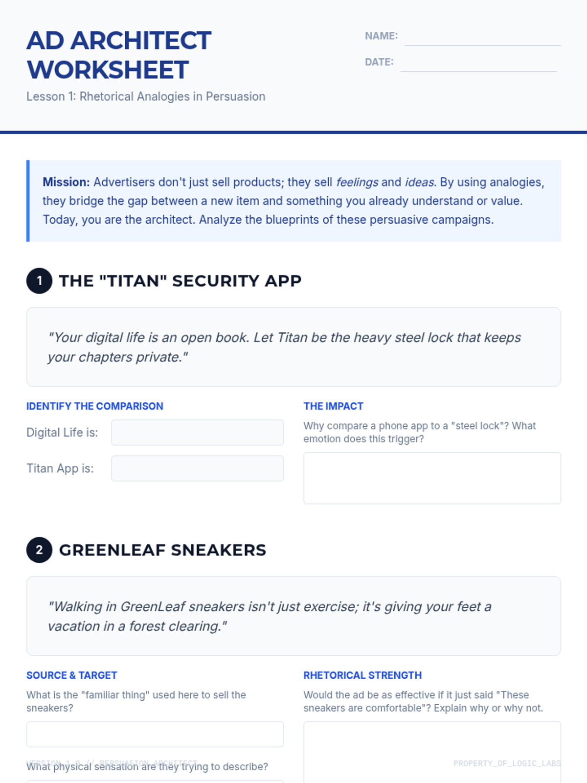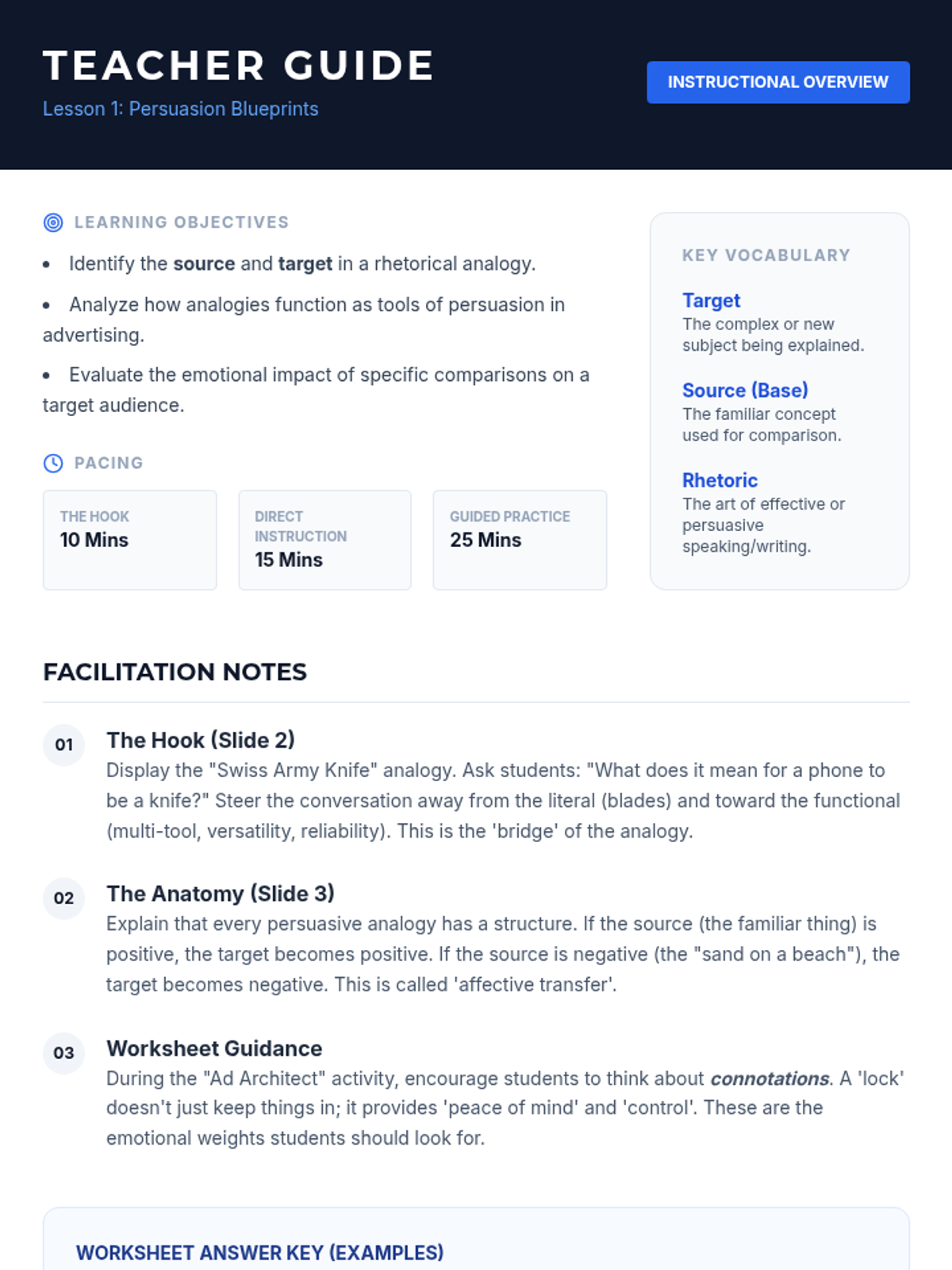 This sequence explores the rhetorical power of analogies in persuasion, speeches, and debate. Students analyze historical and modern examples to understand how comparisons sway opinions and learn to identify logical fallacies like the False Analogy.