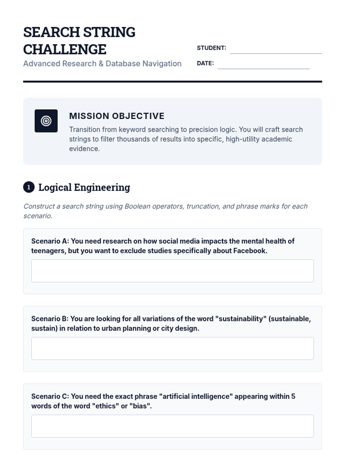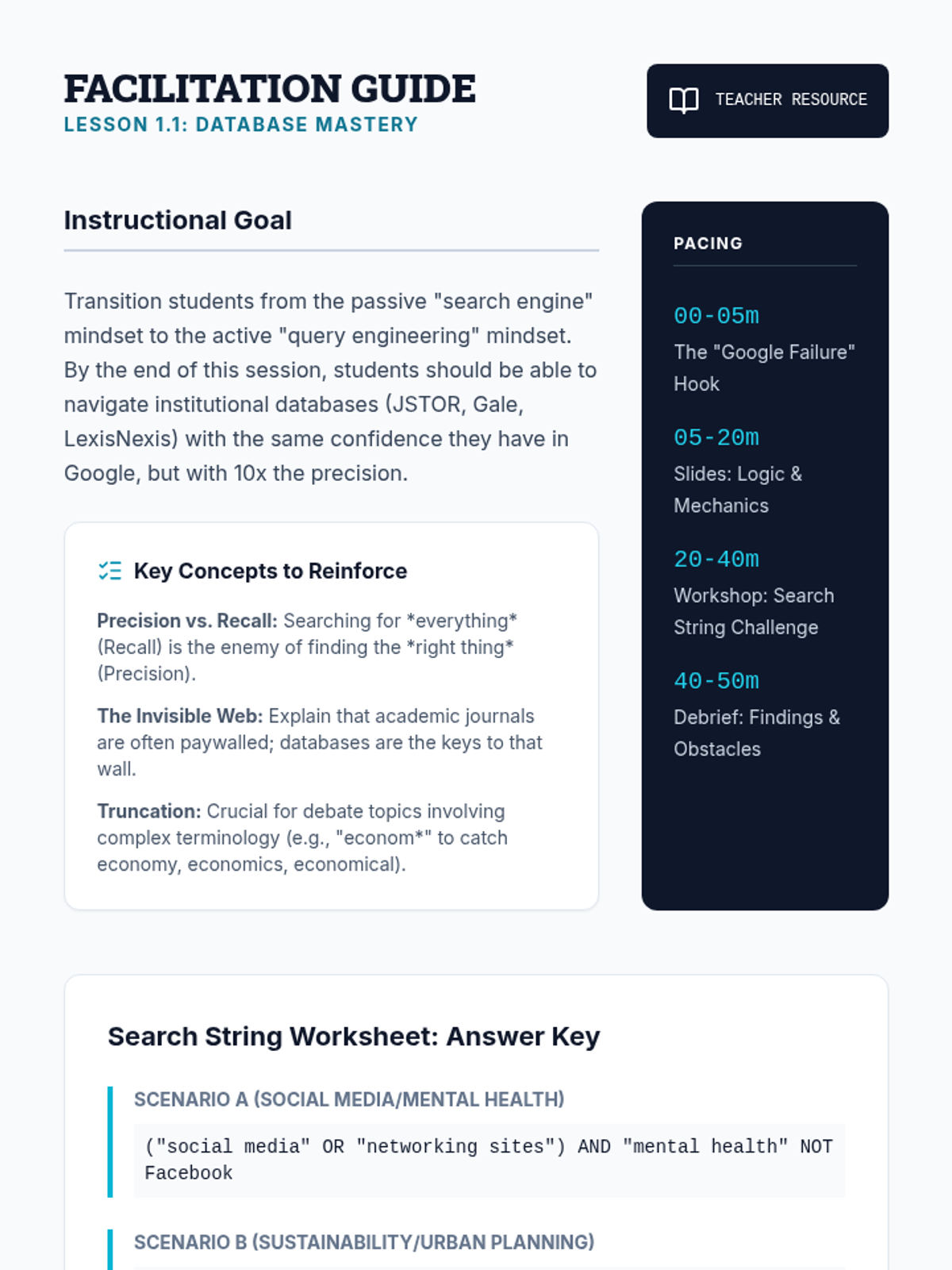 This sequence equips 12th-grade students with collegiate-level research skills, focusing on advanced database navigation, methodology evaluation, lateral reading, and research ethics. Students transition from basic searching to critical source synthesis, preparing them for high-level academic debate and university-level writing.