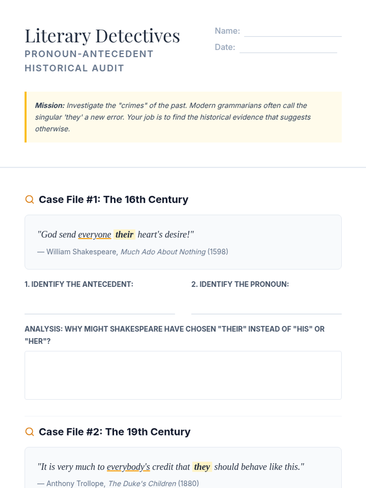 This sequence explores the evolution of pronouns and antecedents, specifically focusing on the singular 'they' and gender-neutral language. Students analyze historical usage, compare modern style guides, and debate the tension between prescriptive and descriptive grammar.