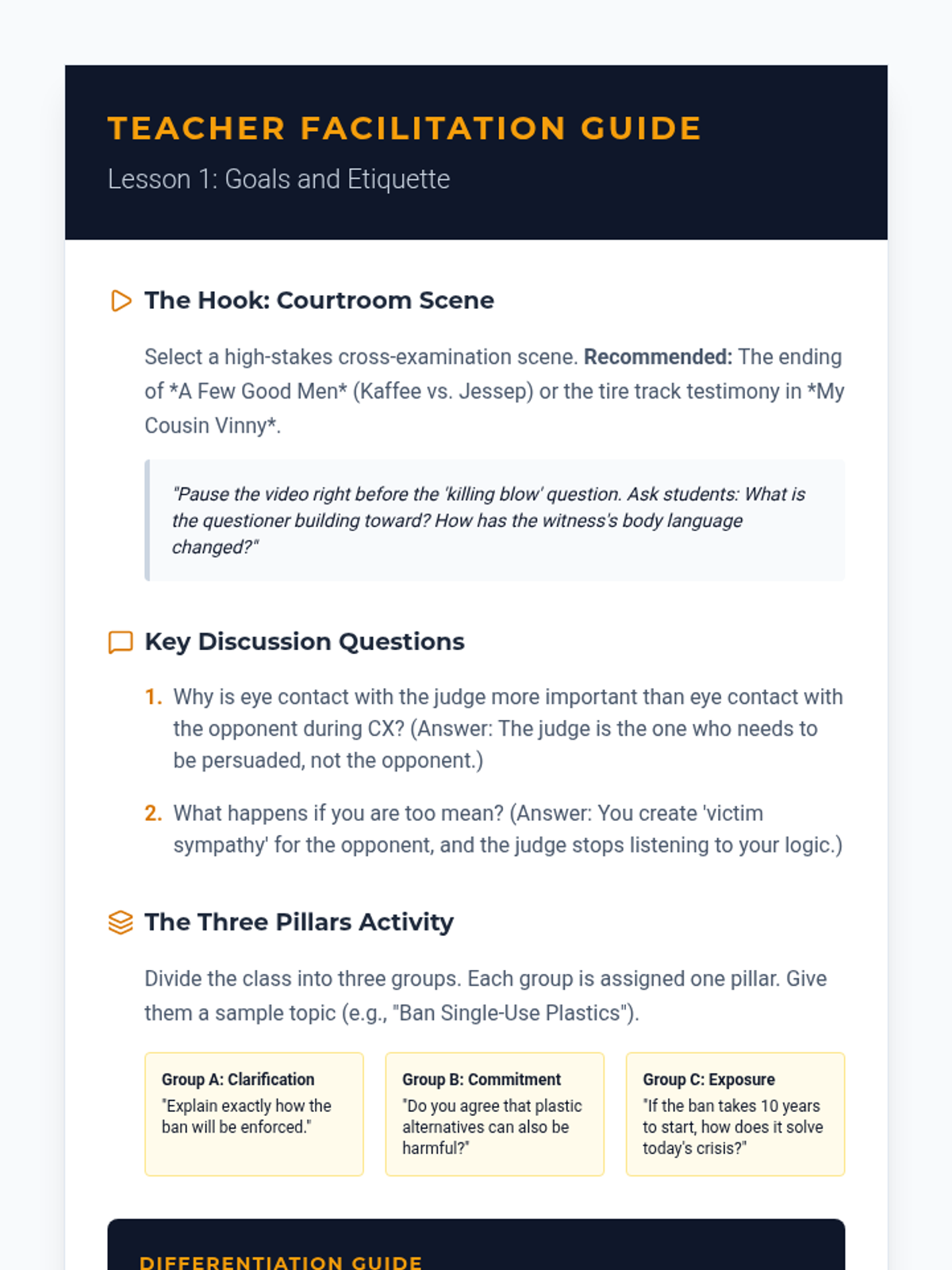 A comprehensive sequence for undergraduate students on the strategic use of cross-examination in competitive debate. This unit moves from foundational etiquette and question syntax to complex logical traps and the integration of concessions into rebuttals.