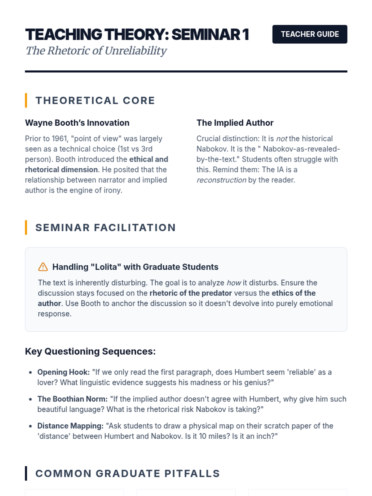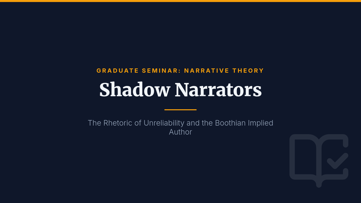 A graduate-level exploration of narrative theory, focusing on the mechanisms of unreliable narration through the lenses of Wayne Booth and James Phelan. Students examine the rhetorical, psychological, and ethical dimensions of stories where the teller cannot be trusted.