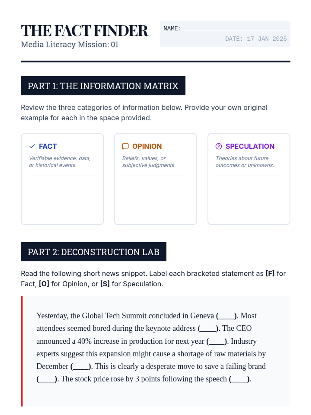 This sequence focuses on information literacy and the evaluation of source validity within the context of a nonfiction book study. Students act as investigative journalists, scrutinizing author credibility, source integration, fact-checking claims, and identifying logical fallacies, culminating in an editorial board simulation.