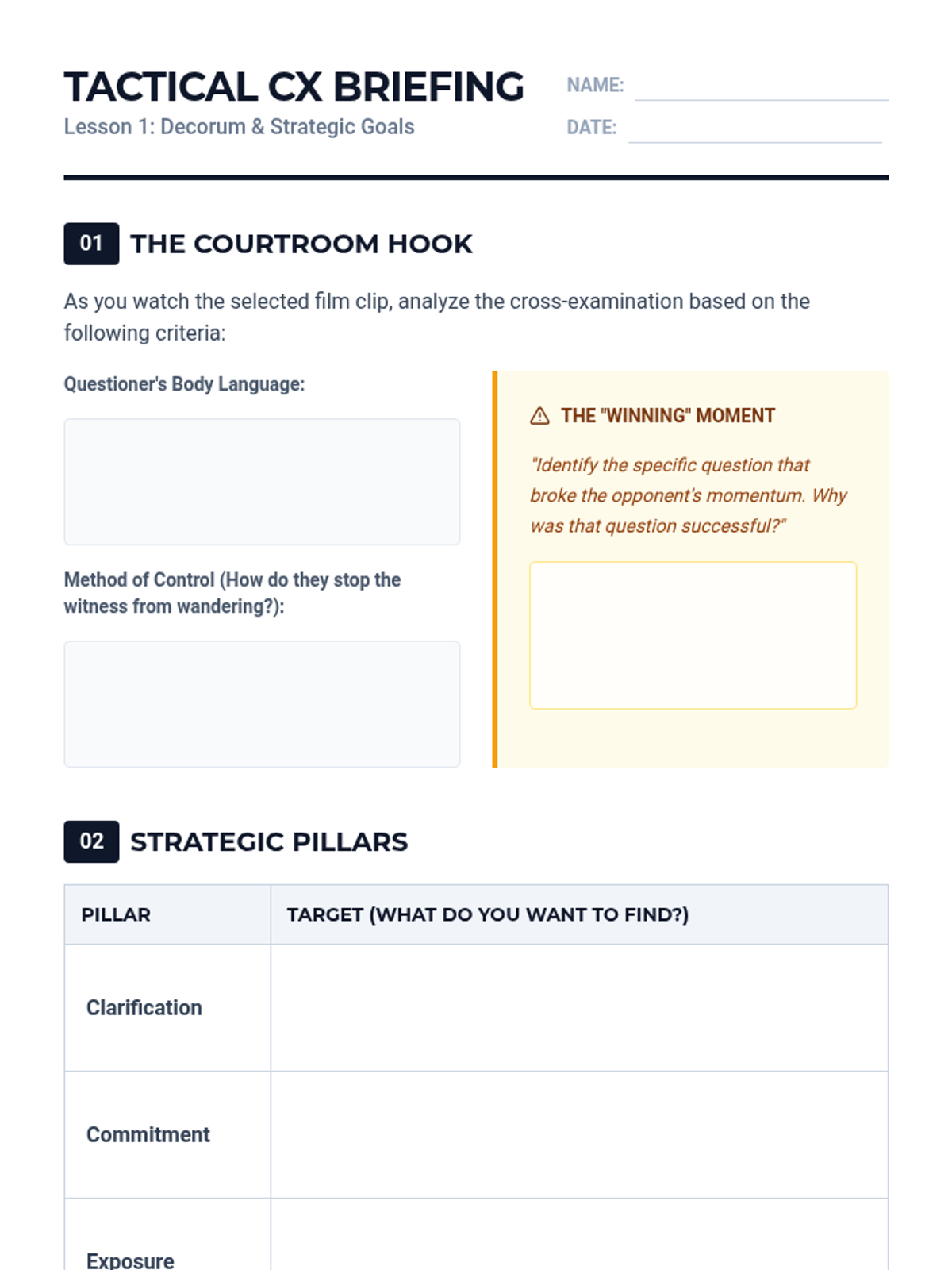 This sequence immerses students in the technical mechanics of cross-examination, moving from the fundamentals of question construction to advanced logical dismantling. Students learn to formulate tight, leading questions, identify logical fallacies, and maintain poise under pressure.