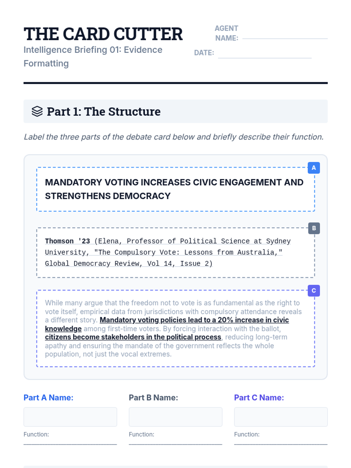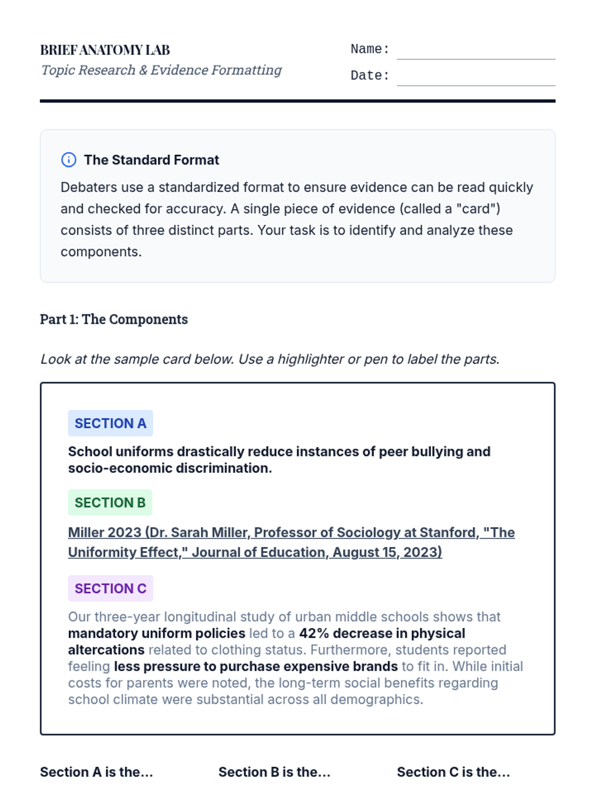 This sequence teaches 11th-grade students the technical art of 'cutting cards' and organizing debate briefs. Students progress from formatting individual pieces of evidence to constructing comprehensive affirmative and negative positions using the Toulmin model.