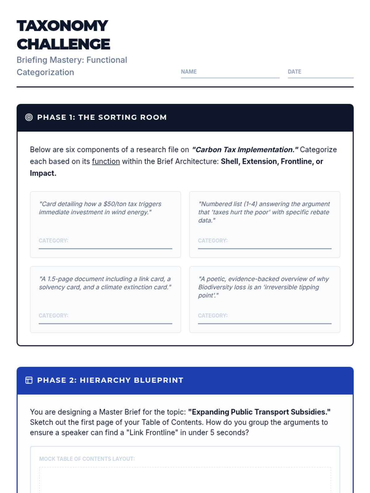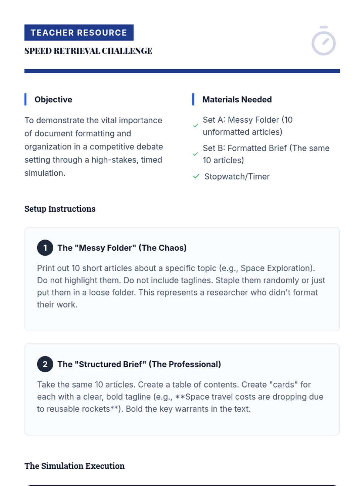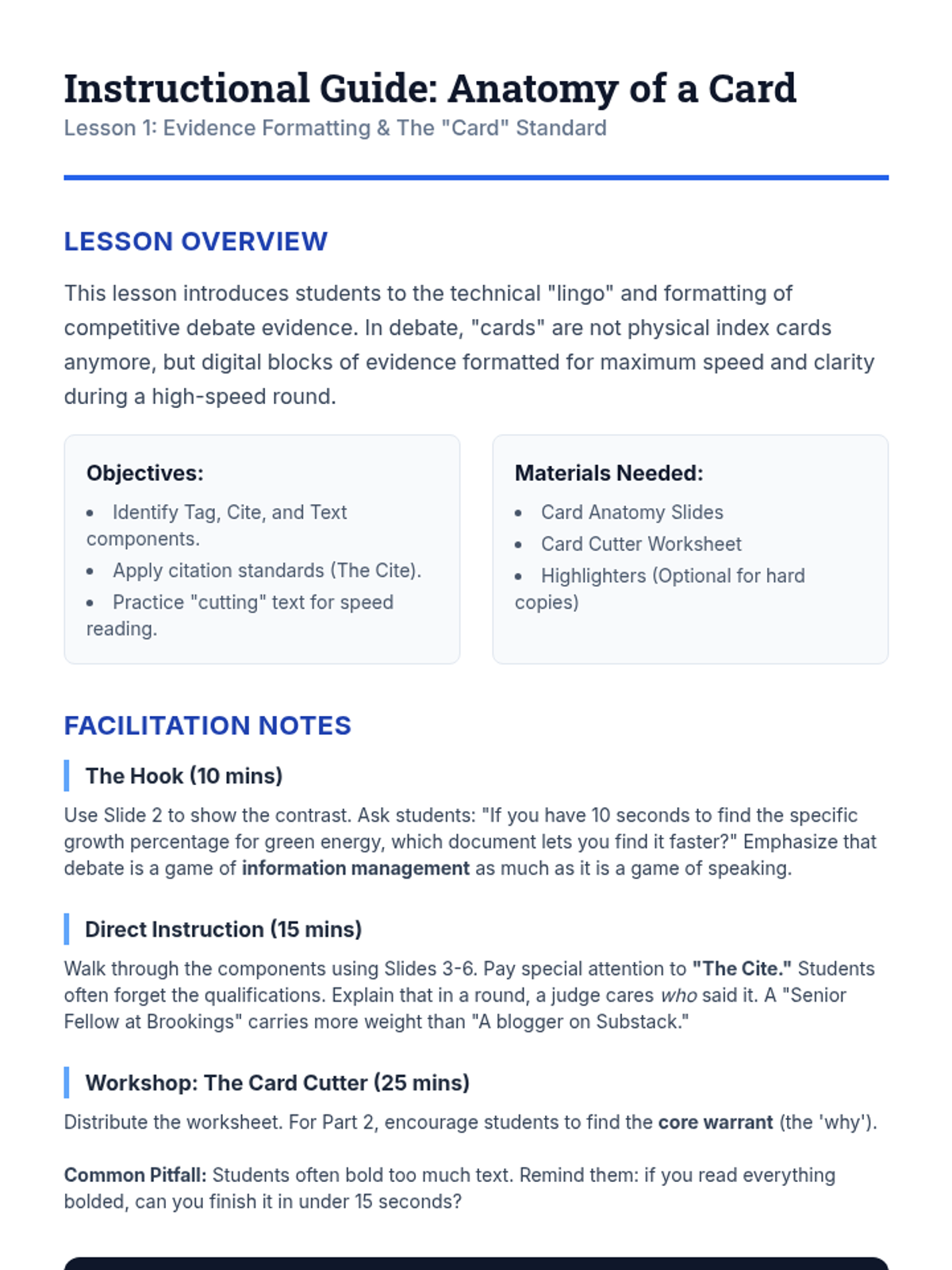 A comprehensive sequence teaching 8th-grade students the technical and ethical skills required to construct professional debate briefs, from card cutting to logical categorization.