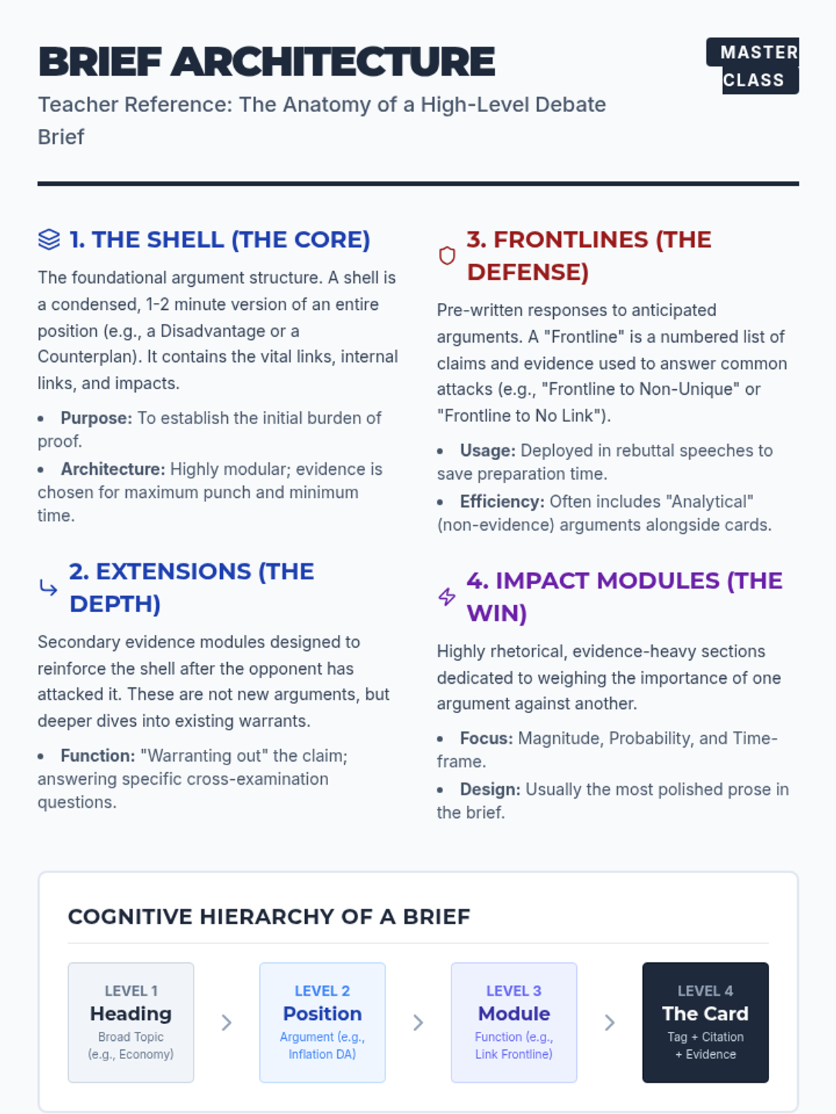 A comprehensive workshop-based sequence for graduate students focusing on the architecture, ethics, and strategic organization of debate briefs. Students progress from structural theory to the construction of a usable, high-level Master Brief.