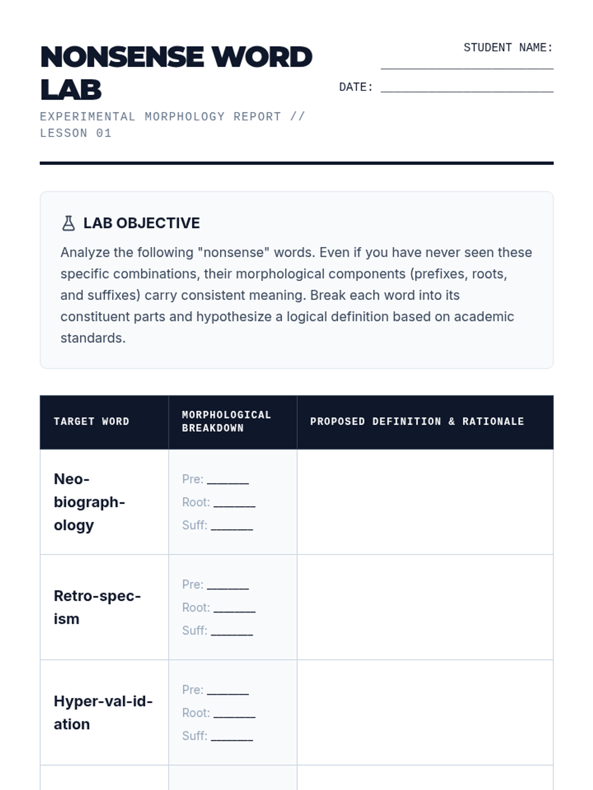 An advanced etymology sequence for 7th Grade ESL students, focusing on Latin and Greek morphemes to decode academic vocabulary across disciplines. Students progress from root identification to creating their own neologisms for modern inventions.