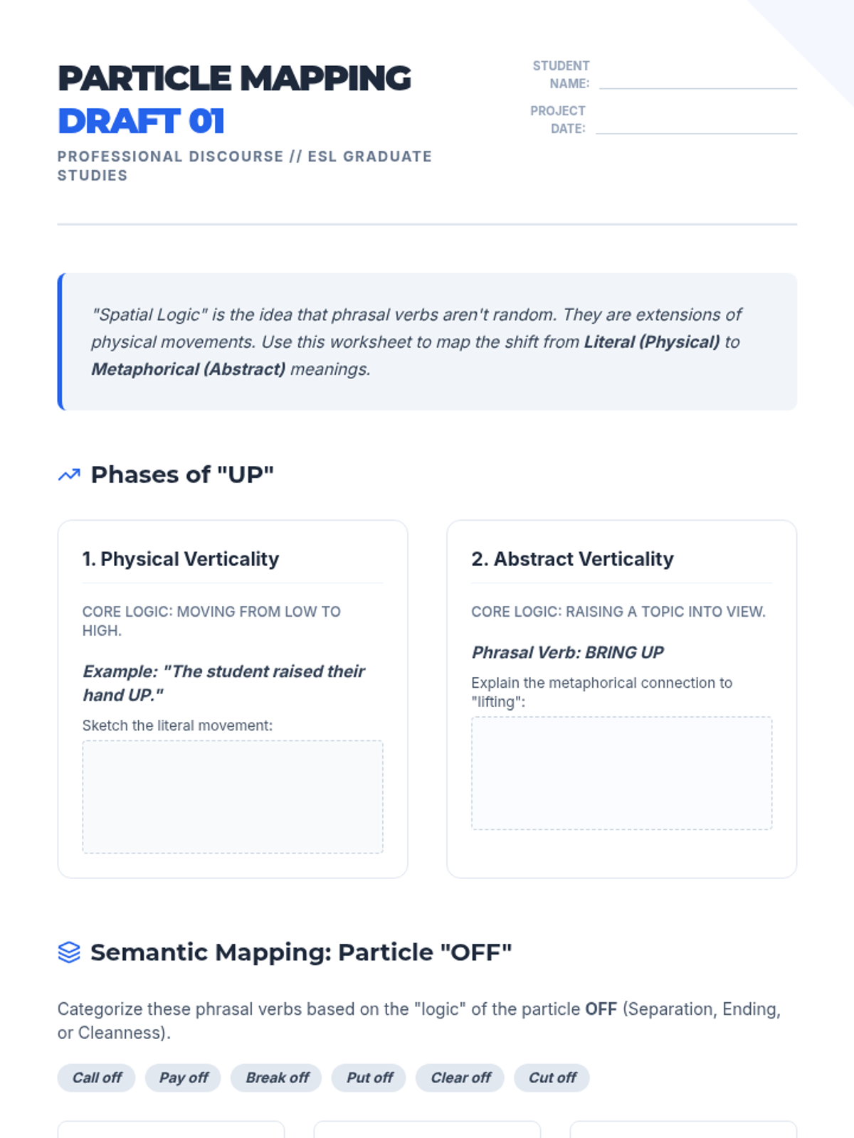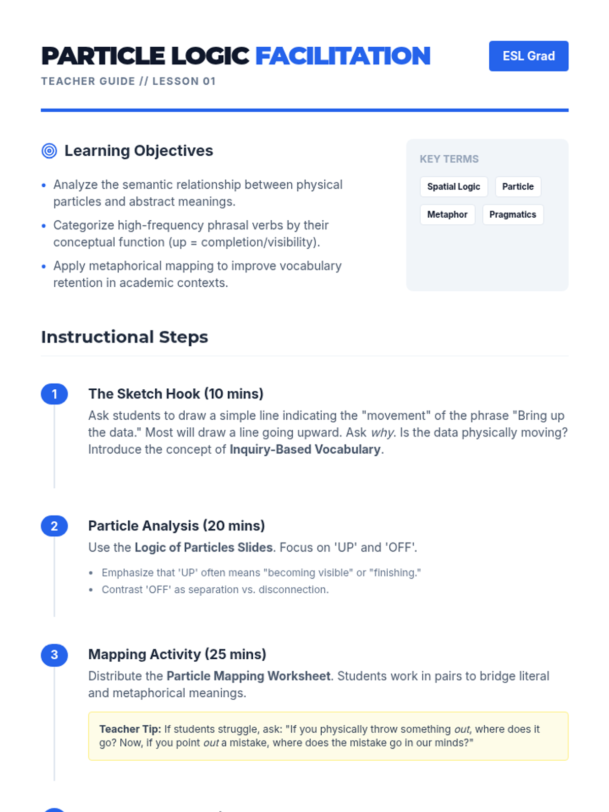 A 5-lesson sequence for intermediate ESL graduate students focused on mastering phrasal verbs and idioms for professional and academic contexts. Students move from the conceptual logic of particles to high-stakes networking simulations, focusing on register and pragmatic appropriateness.