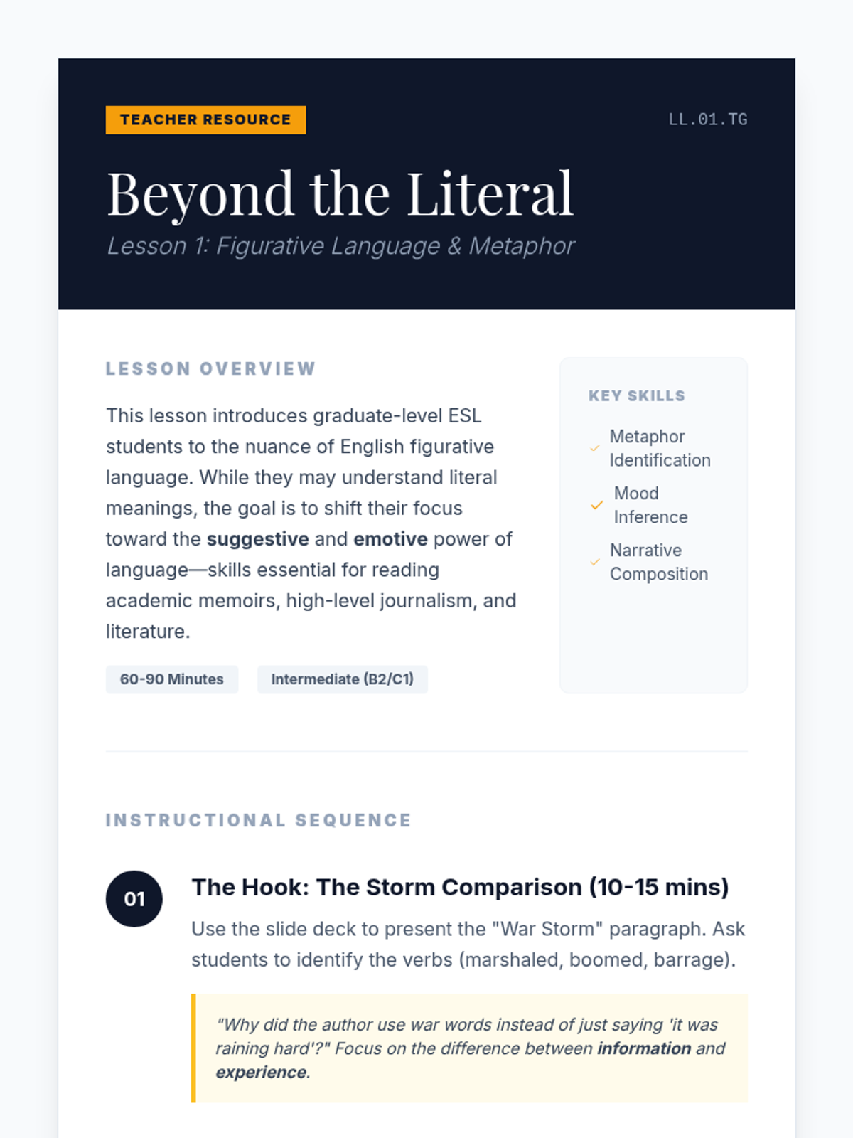 A high-level ESL sequence designed to prepare 11th-grade students for university lectures. It covers macro-structures like signposting, micro-skills like hedging and rhetorical appeals, and ends with a full lecture synthesis seminar.