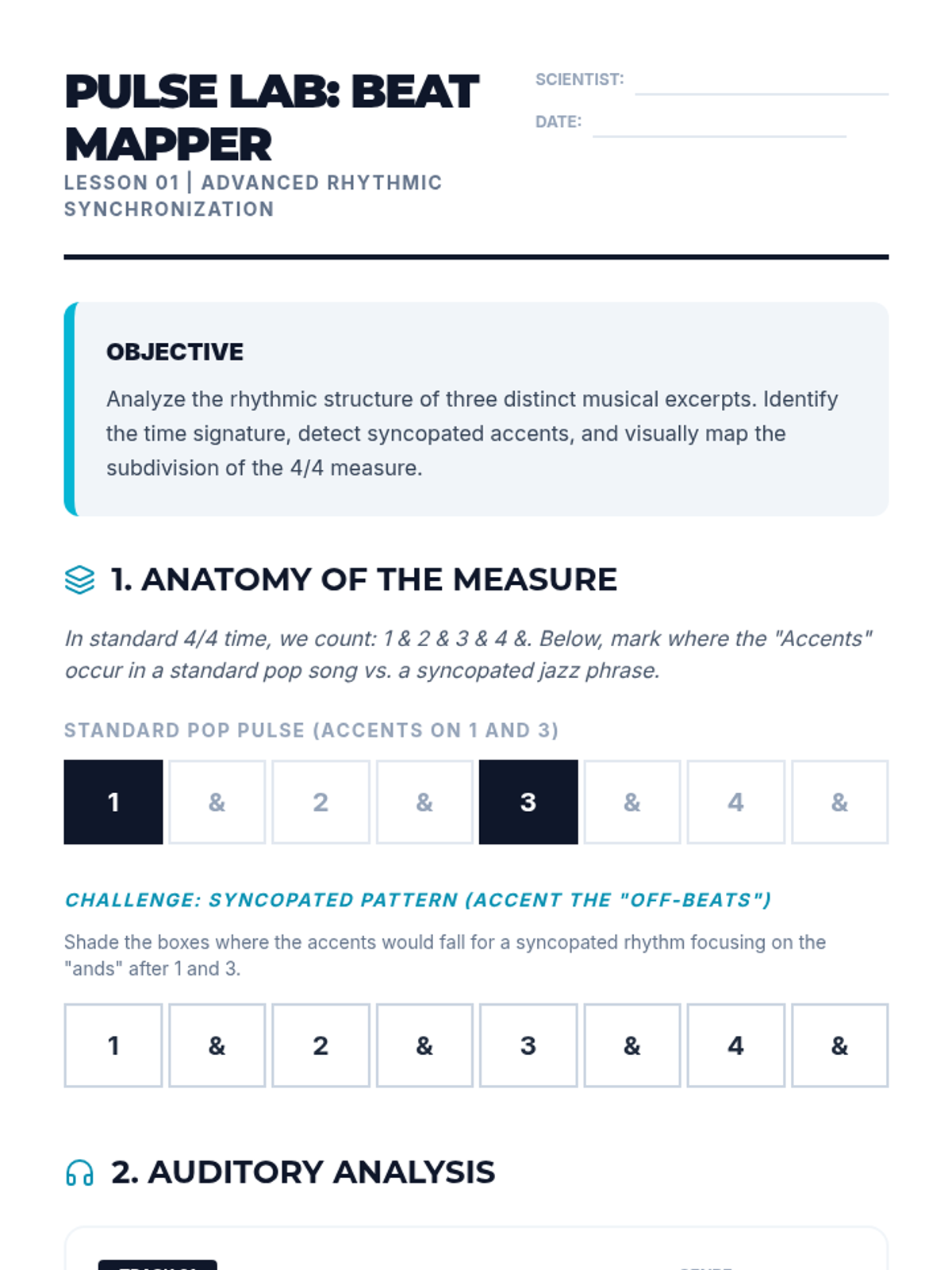 A comprehensive sequence for undergraduate students focused on the analytical deconstruction of musical timing and its physiological application in movement. Students progress from basic meter identification to complex subdivisions, phrasing, and asymmetrical meters, culminating in a precision performance lab.