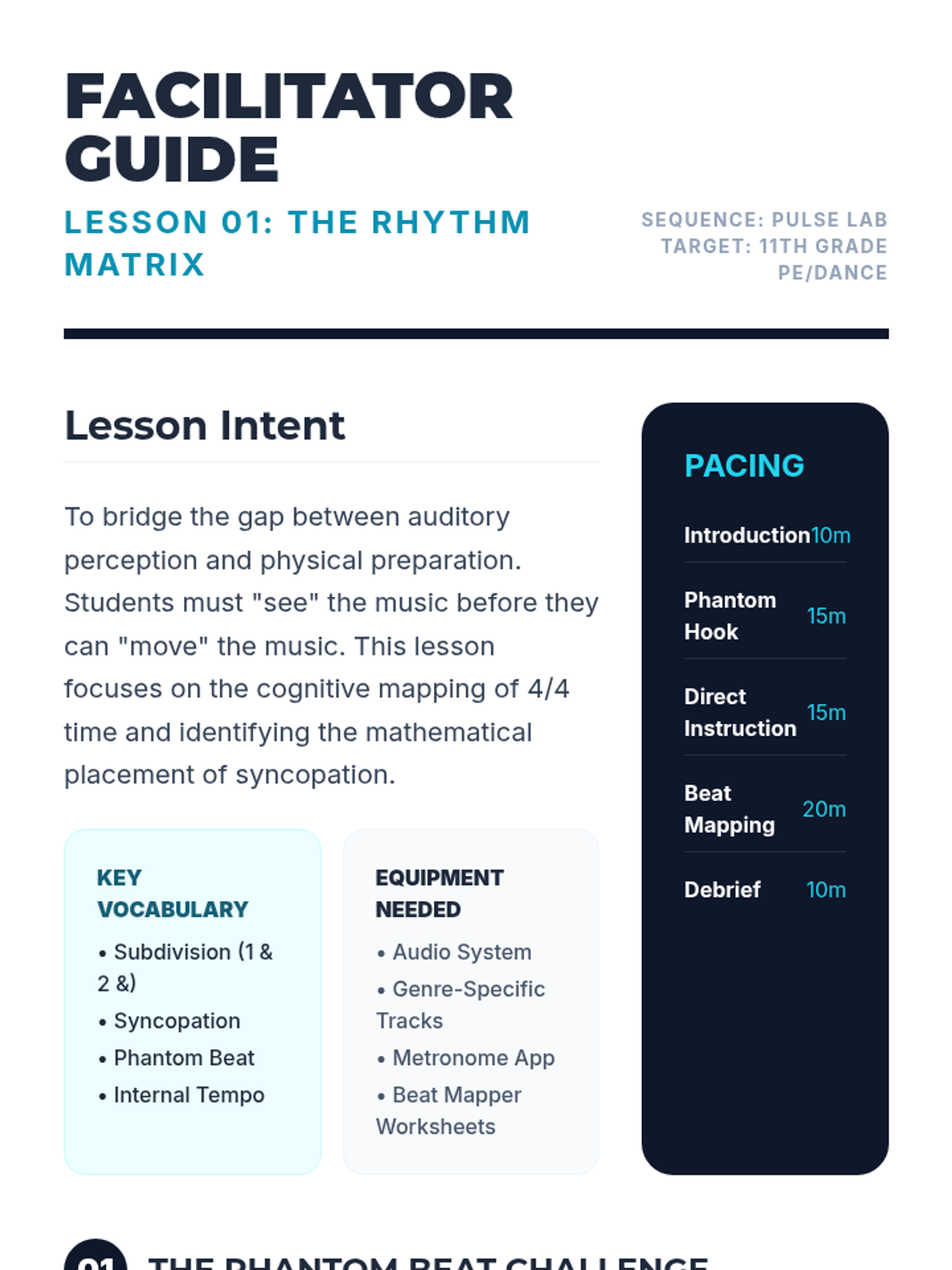 An advanced 11th-grade unit exploring the intersection of music theory and dance through syncopation, polyrhythms, and temporal independence. Students develop the neuromuscular control to execute complex rhythmic structures and maintain internal tempo against contrasting external cues.