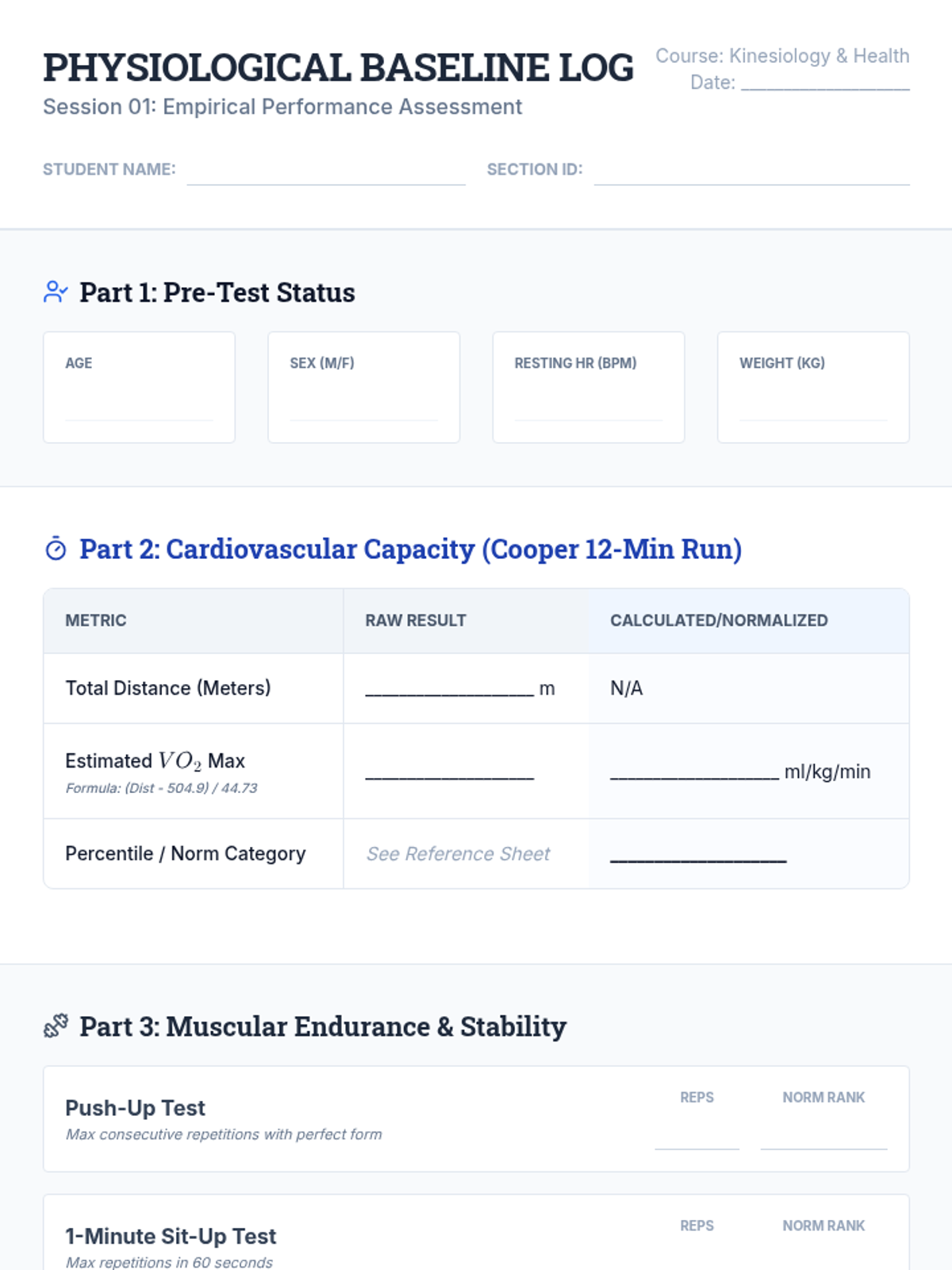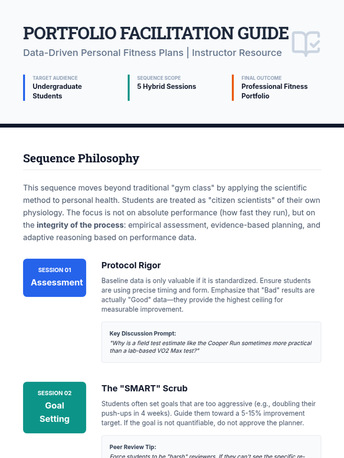 A comprehensive sequence for undergraduate students focused on the scientific application of data-driven fitness planning, assessment, and adjustment. students will develop a professional-grade fitness portfolio through empirical baseline testing, SMART goal formulation, and periodized training design.